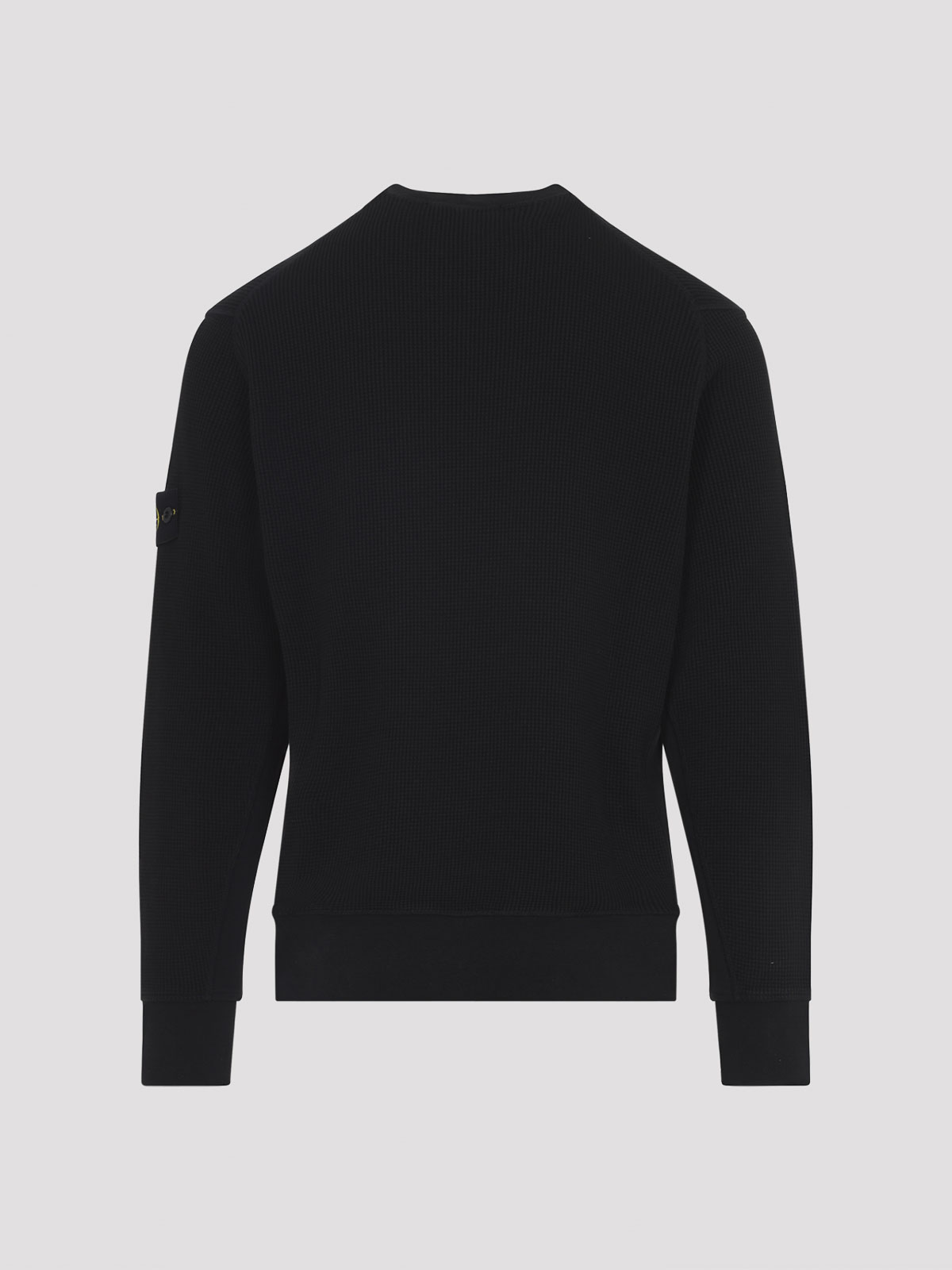 ストーンアイランドブラックコットンスウェットシャツ。ピュアブラックコットンスウェットシャツ、ラウンドネック、ロングスリーブ、右袖にシグネチャーパッチロゴ、リブ編みの袖口と裾、ストレートヘム。