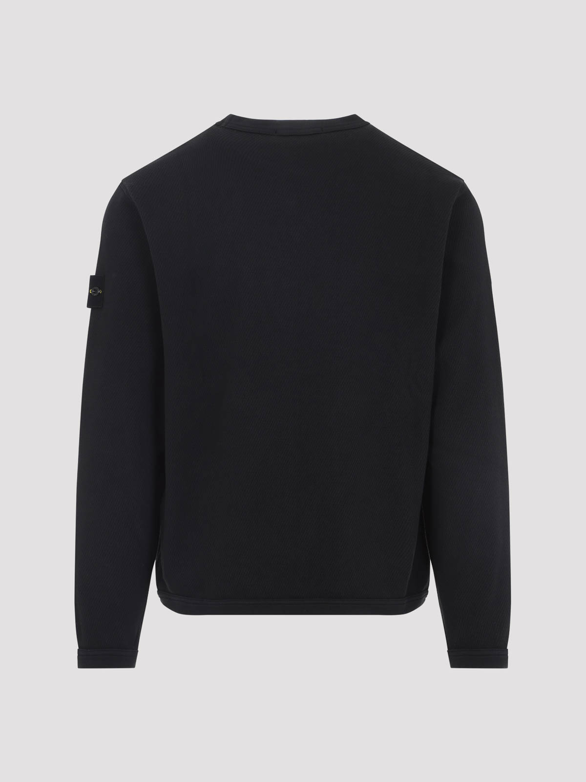 ストーンアイランドブラックコットンスウェットシャツ。ピュアブラックコットンスウェットシャツ、ラウンドリブネック、ロングスリーブ、右袖にシグネチャーパッチロゴ、リブ編みの袖口と裾、ストレートヘム。
