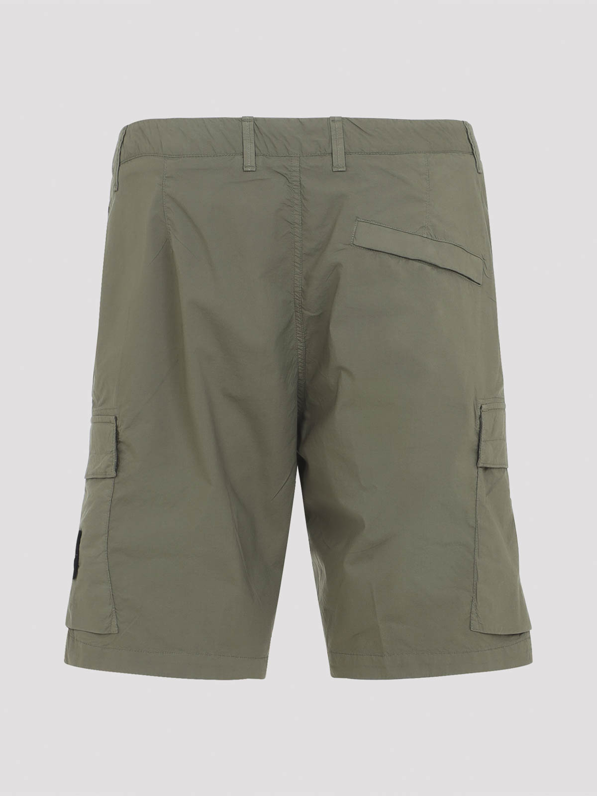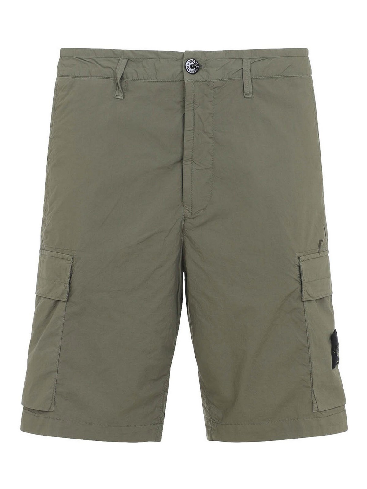 ストーンアイランドのミリタリーグリーンコットンショーツ。ミリタリーグリーンコットン製、レギュラーウエスト、ベルトループ、フロントボタンとフライジッパー、サイドジッパーポケット、2つのサイドジッパーポケット、アイコニックなロゴパッチ付きのカーゴポケット、バックウェルトポケット、ストレートヘム。