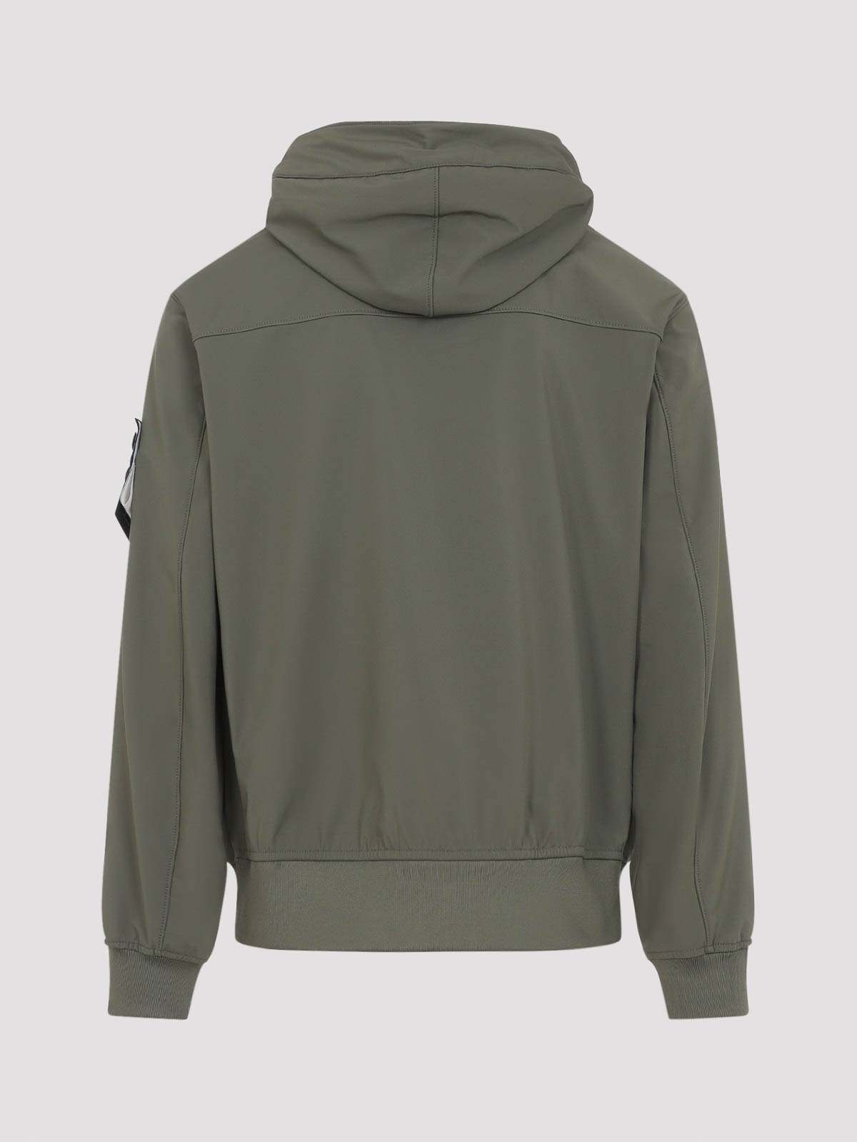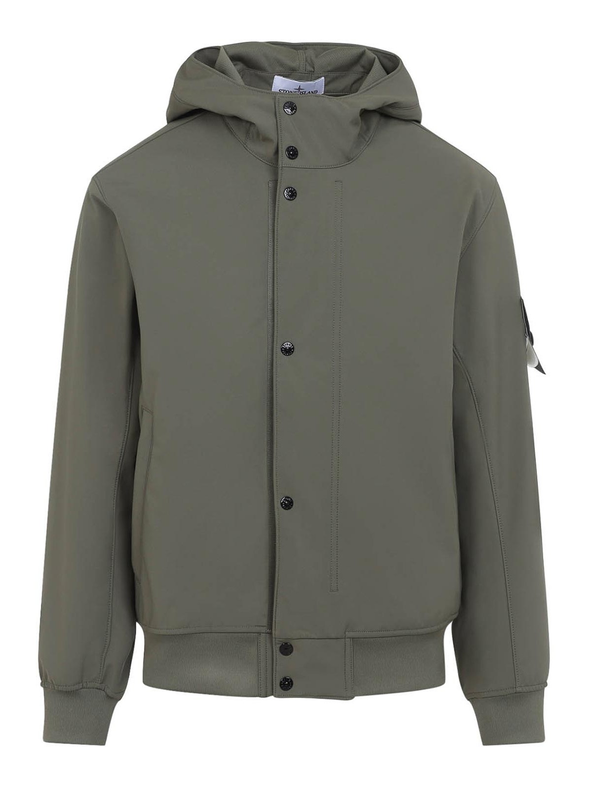 ストーンアイランドのミリタリーグリーンのショートパーカー。ポリエステルとエラステンのブレンドで作られています。トーナルフード、フロントボタン留め、サイドポケット、ロングスリーブ、右袖にシグネチャーパッチロゴ、リブ編みの袖口と裾、ストレートヘム。