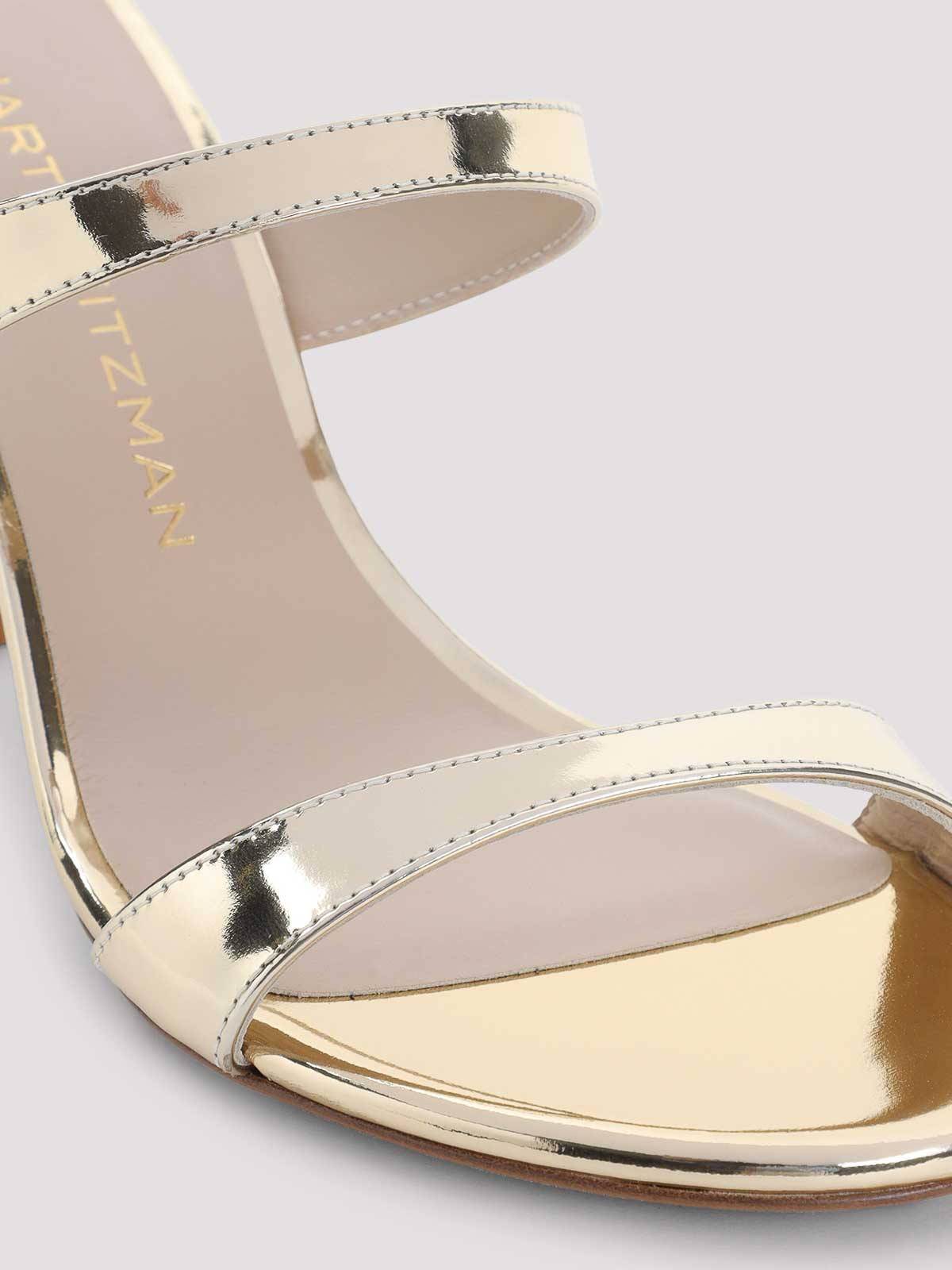 Stuart weitzman プラチナレザーヌーディストスライド 85 サンダル。ピュアプラチナレザーサンダル、ラウンドオープントゥ、トップトーナルストラップ、スリッポンスタイル、ミュールデザイン、トーナルシンヒール、レザーソール。