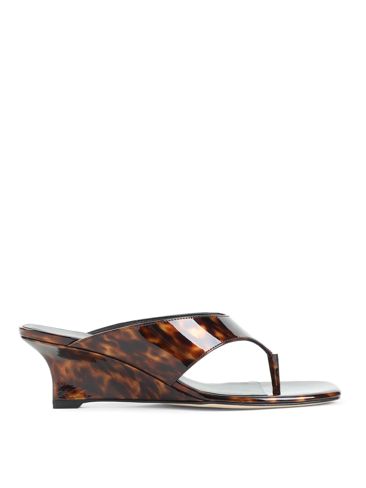Stuart Weitzman クラシックブラウンヴィニーウェッジトング 50 サンダル。ピュアクラシックブラウンポリウレタンサンダル、スクエアオープントゥ、フリップフロップデザイン、トップトーナルストラップ、スリッポンスタイル、トーナルウェッジ。
