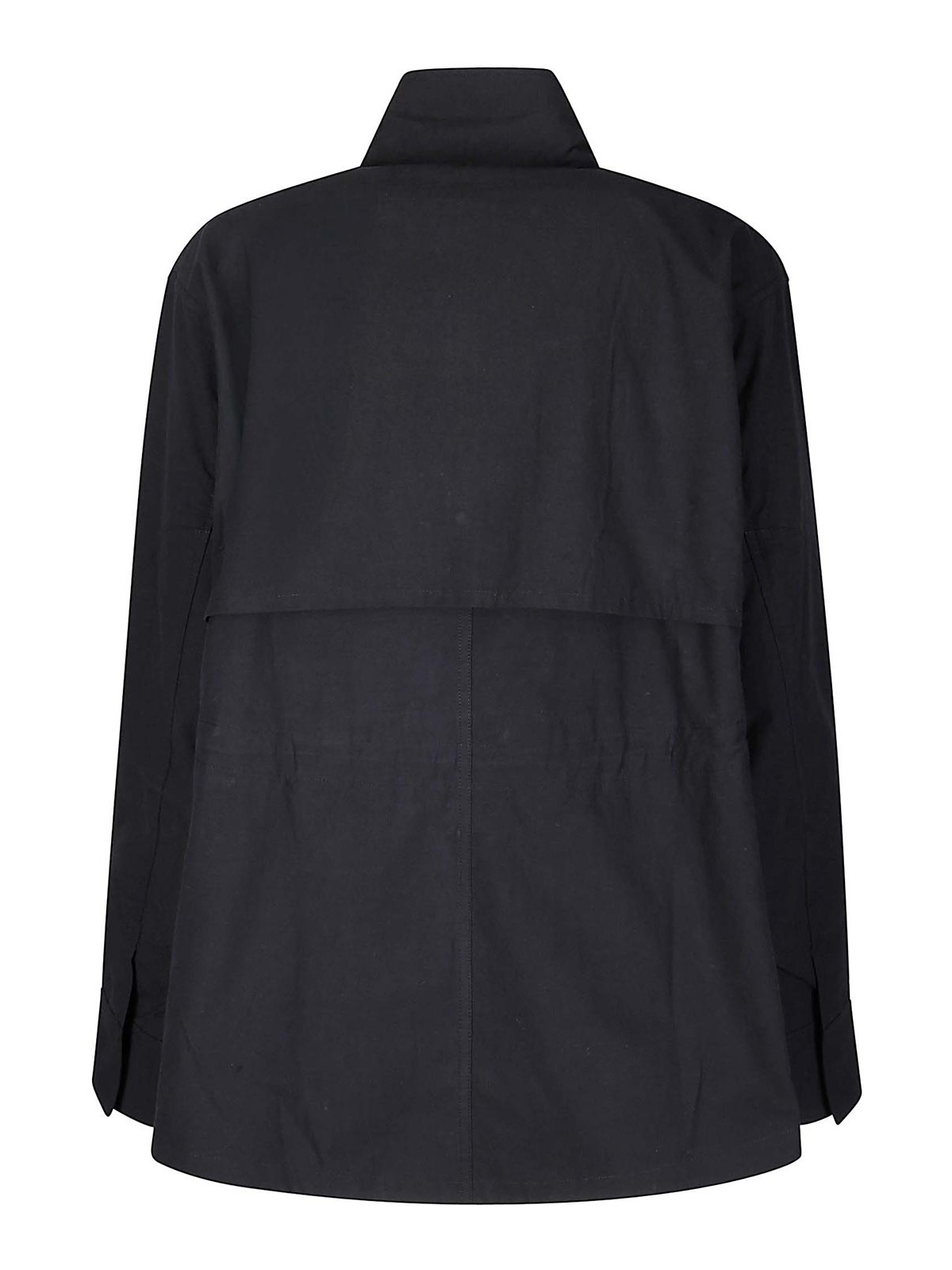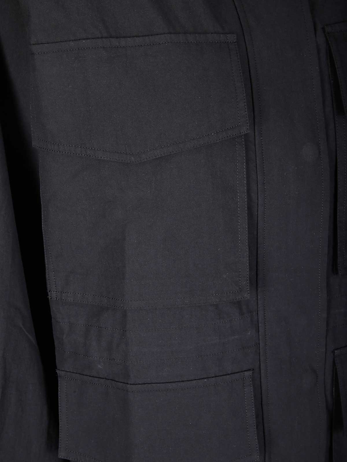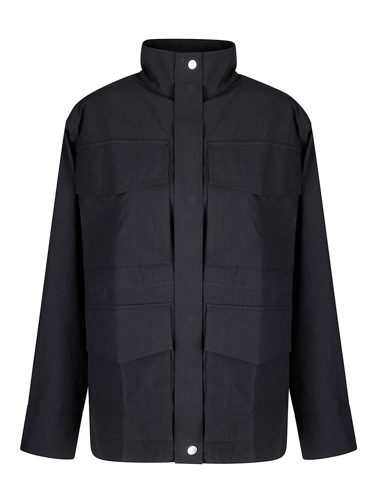 ミリタリーデザインのブラックマルチポケットジャケット、ハイカラー、ジッパー、ボタン付き、ややオーバーサイズフィット。