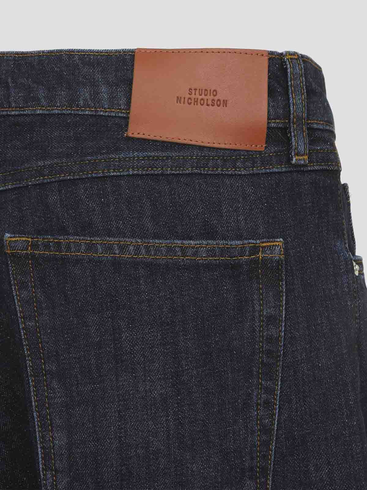 スタジオニコルソンメリルボーン限定ブルーコットンジーンズ。ブルーコットンデニム製の5ポケットジーンズ。ベルトループ、フロントボタンとジップフライファスナー、ロークロッチ、バックウエストにブランドラベル、ストレートレッグが特徴です。