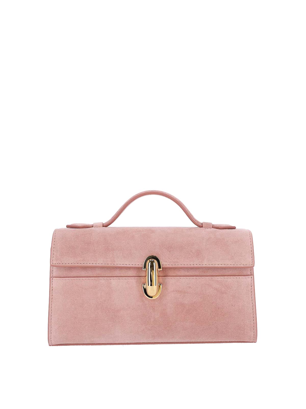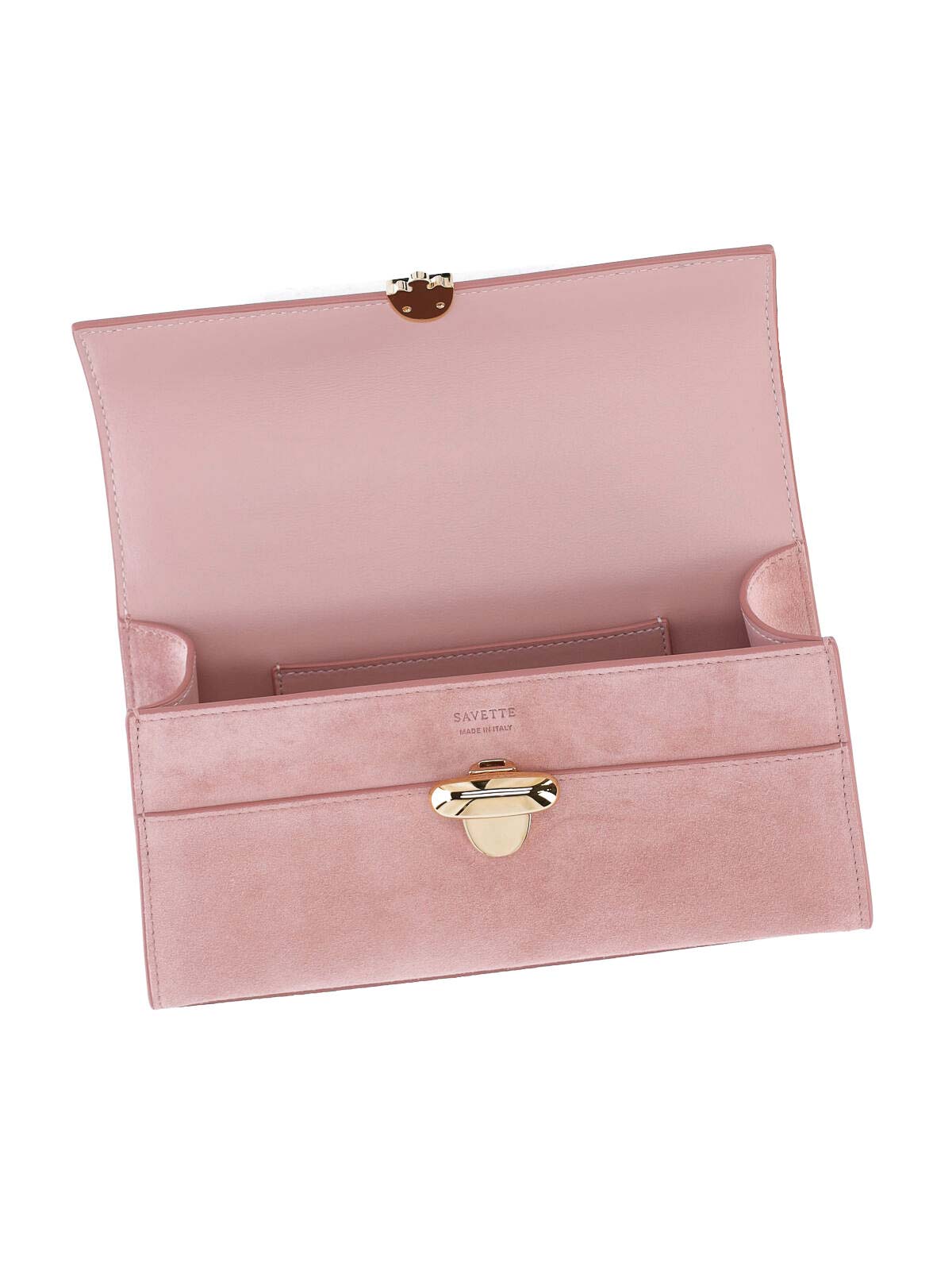 ピンクのカーフスエード製シンメトリーサヴェットクラッチバッグ、トップハンドル1つ、フロントにゴールドのメタルクロージャー、内側にエンボス加工ロゴ、内側にフラットポケット1つ、メインの内部コンパートメント1つ。