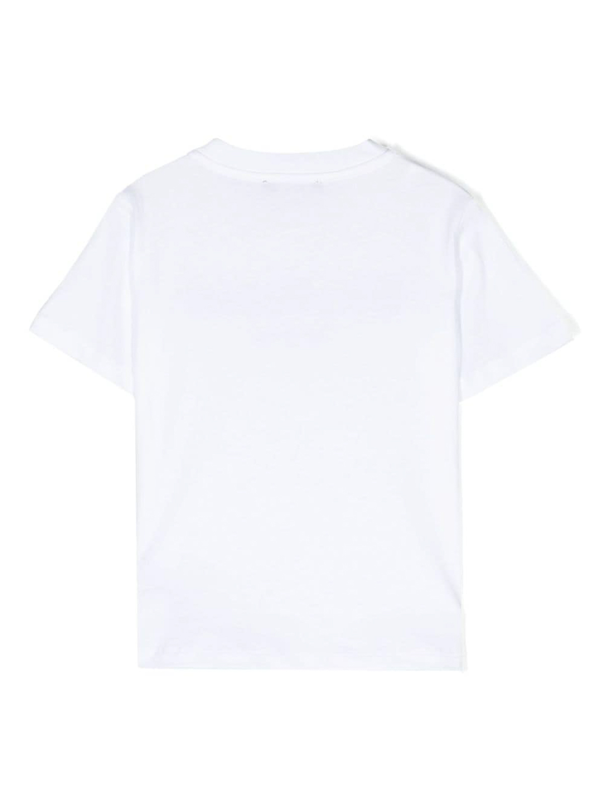balmain kidsの白/黒のロゴプリント半袖Tシャツは、フロントクルーネック、半袖、ストレートヘム、サイズ:年式は白/黒のコットンロゴが特徴です。