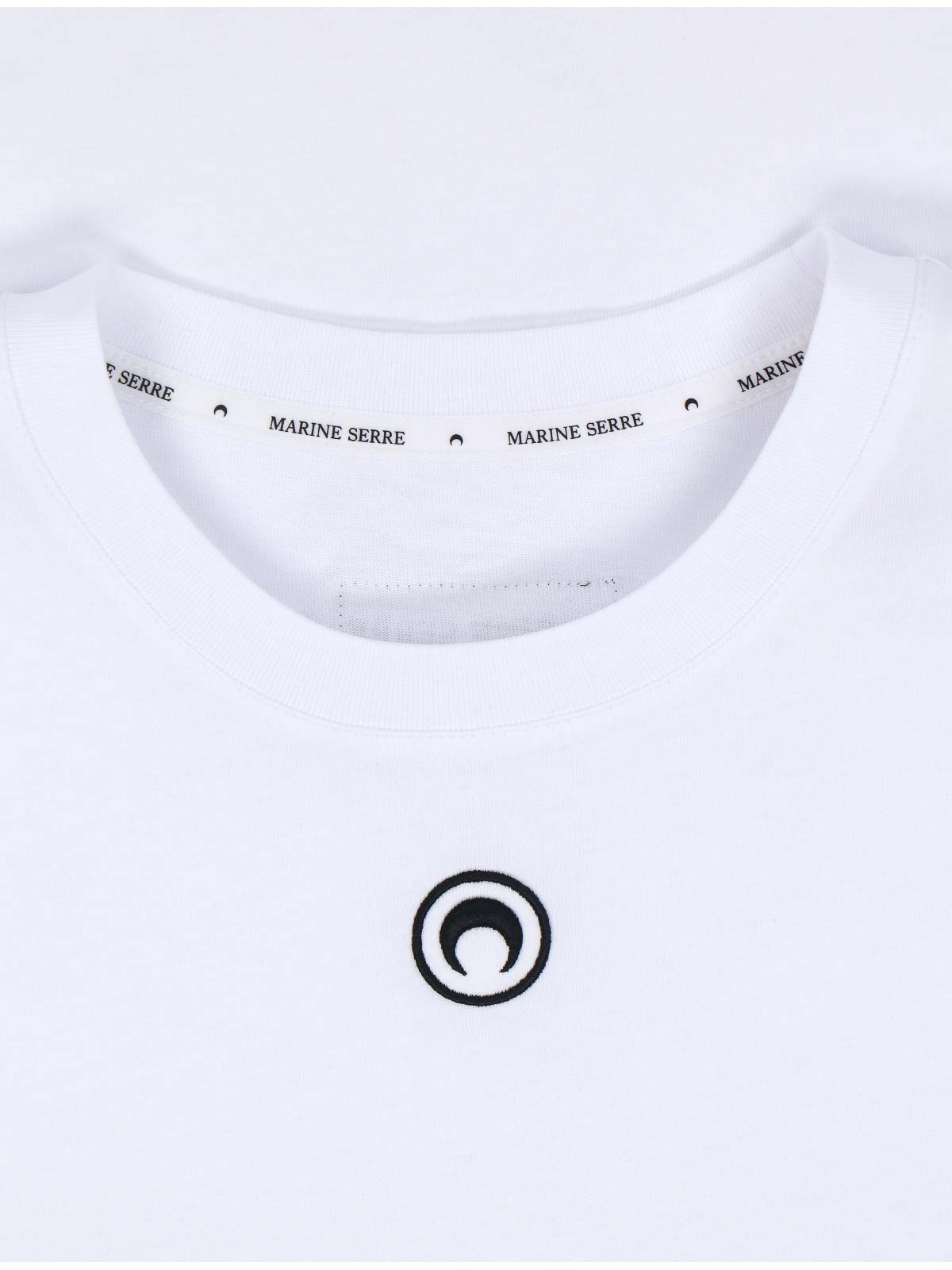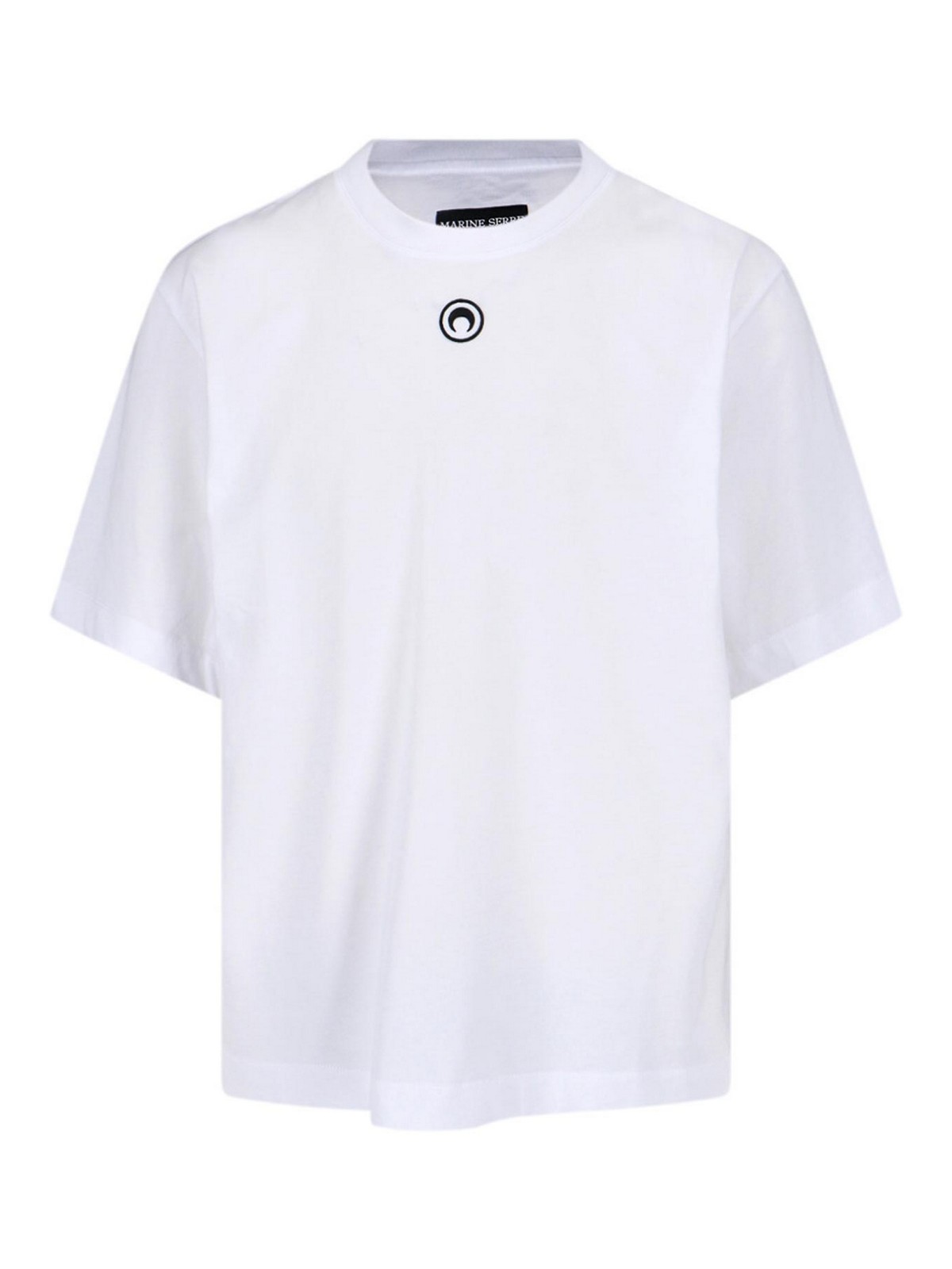 マリンセラムーンTシャツ、ホワイトコットン、クルーネック、ショートスリーブ、フロントロゴ刺繍、ストレートヘム。
