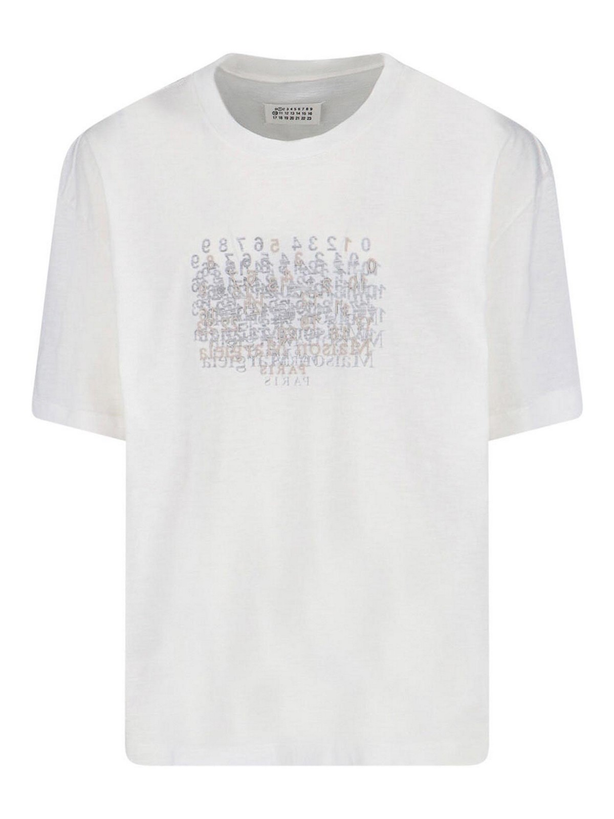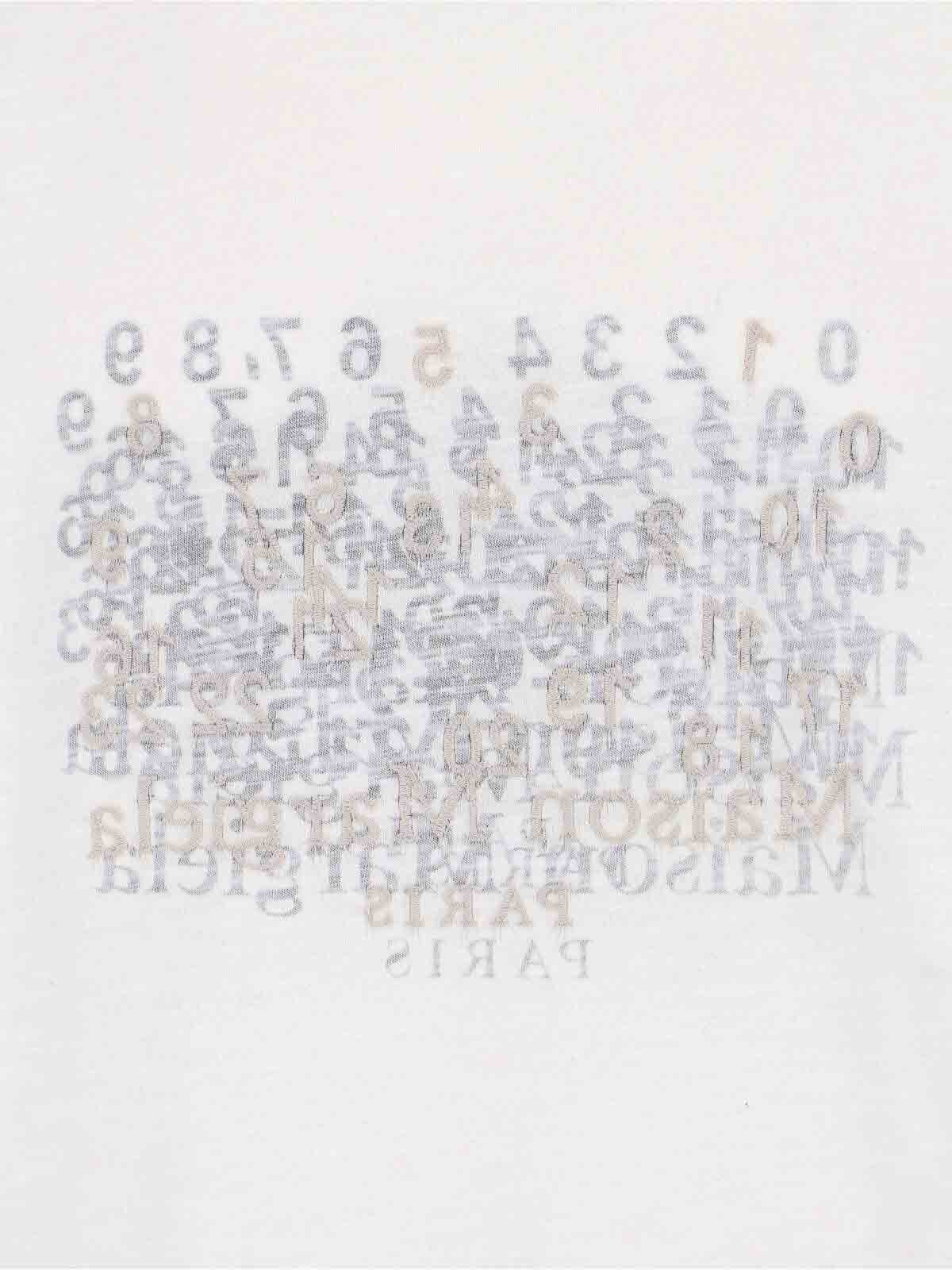 Maison Margielaの数字Tシャツ、ホワイトコットン、クルーネック、半袖、前面にコントラストの効いた数字ロゴのプリントと刺繍、リブ編みの仕上げ、ストレートヘム