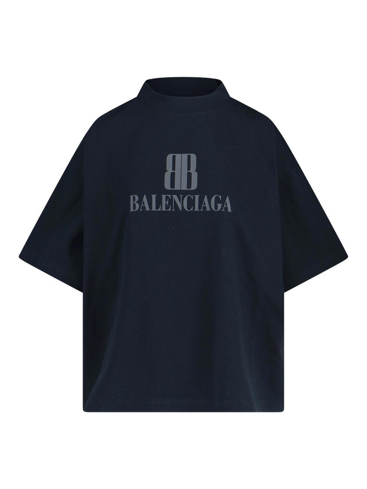 ナノ BB バレンシアガ T シャツ、ブラックコットン、ハイネック、スリークォーツスリーブ、ペットロゴプリント、ストレートオール。