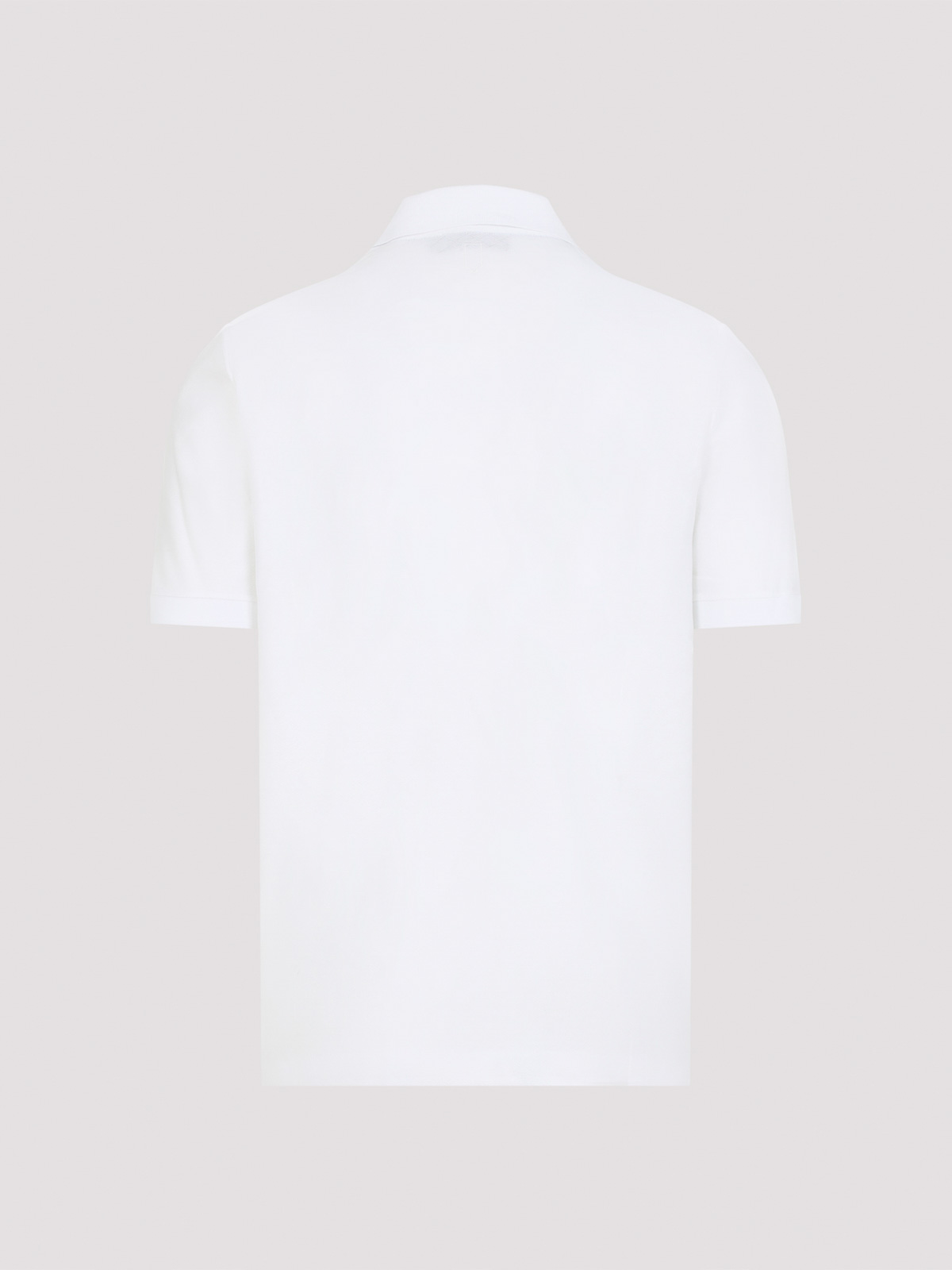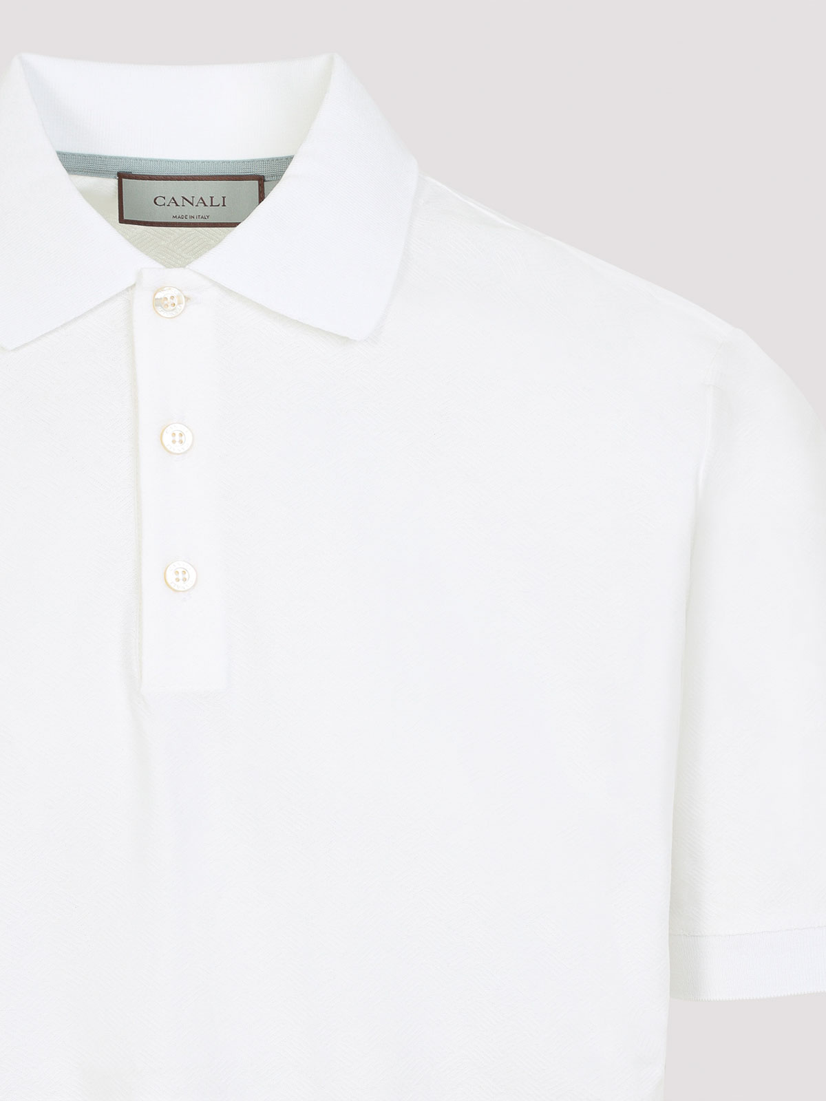 カナリホワイトコットンTシャツ。純白のコットンTシャツ、クラシックなポロカラー、半袖、ストレートヘム、全体に幾何学的な質感。
