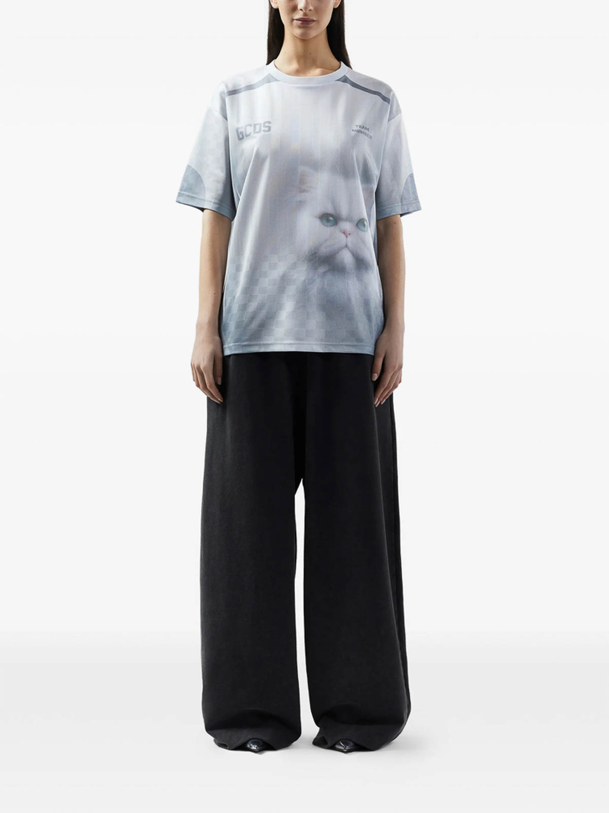 ホワイトオーバーサイズフィットキトンプリントショートスリーブラウンドネック