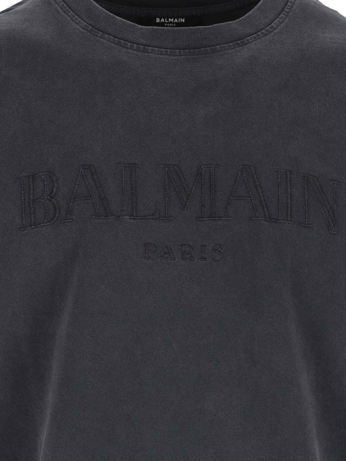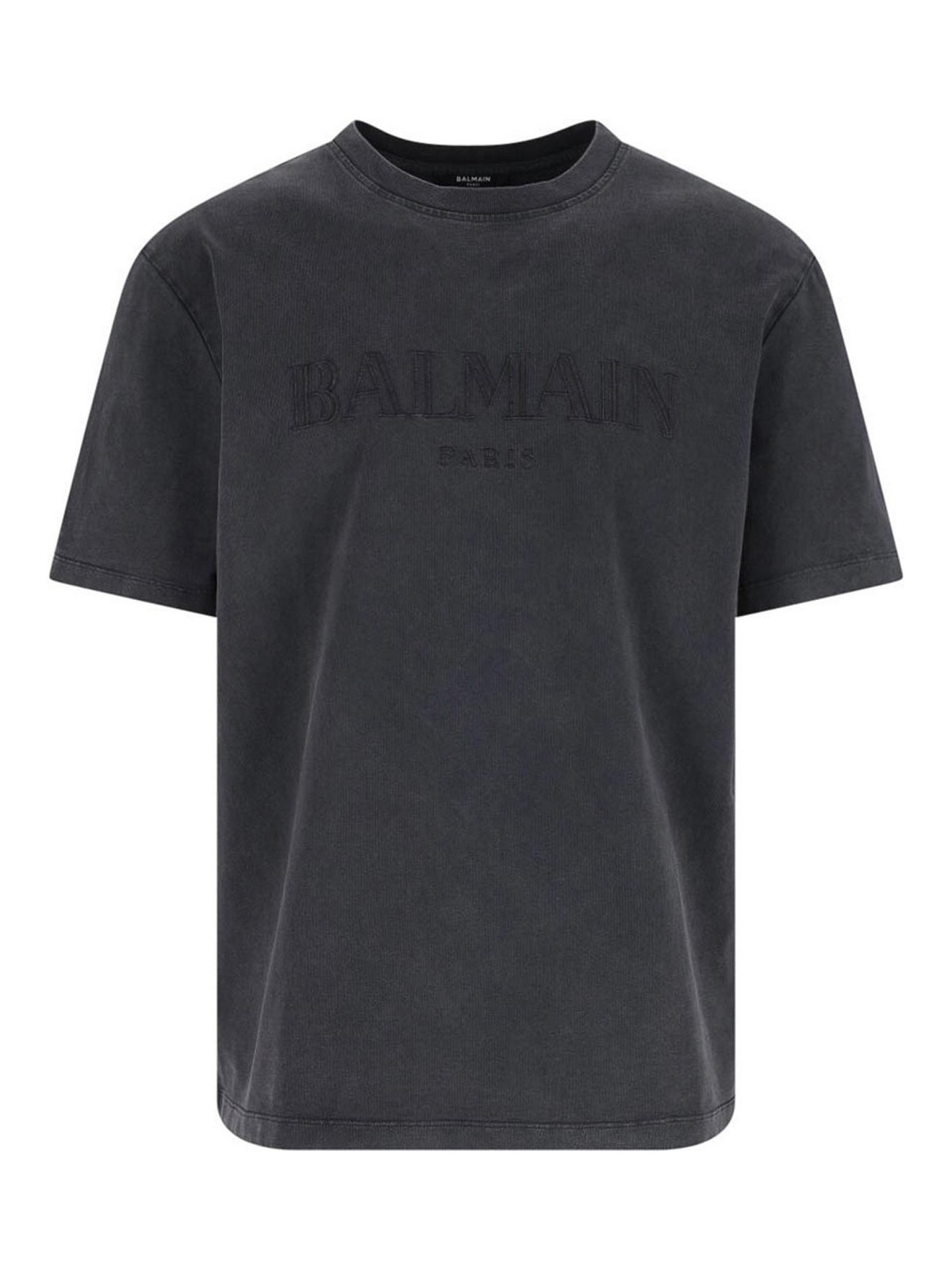 バルマンロゴTシャツ、グレーコットン、ジロコロ、コルテスリーブ、フロントマキシロゴ、オーロドリット。