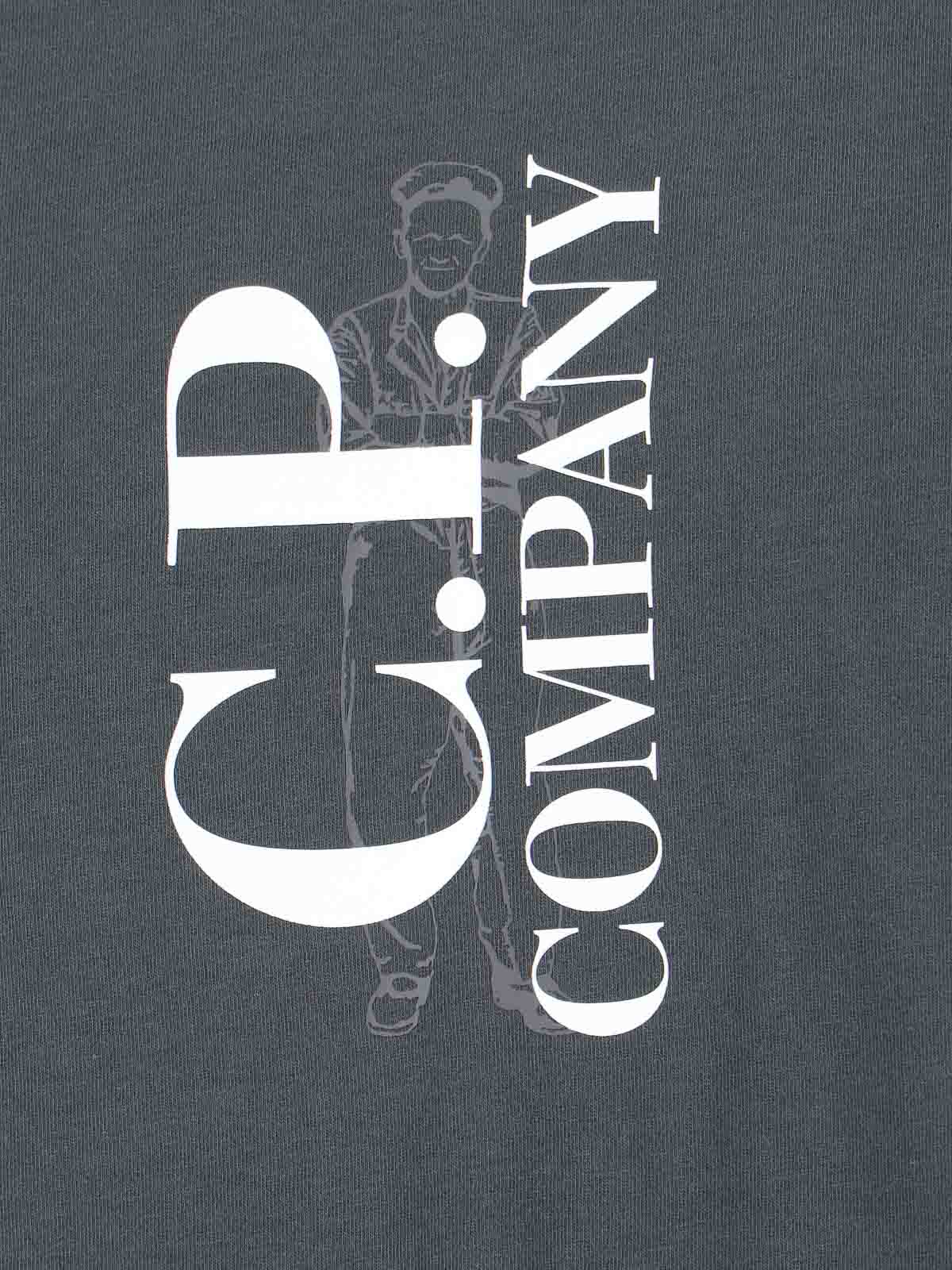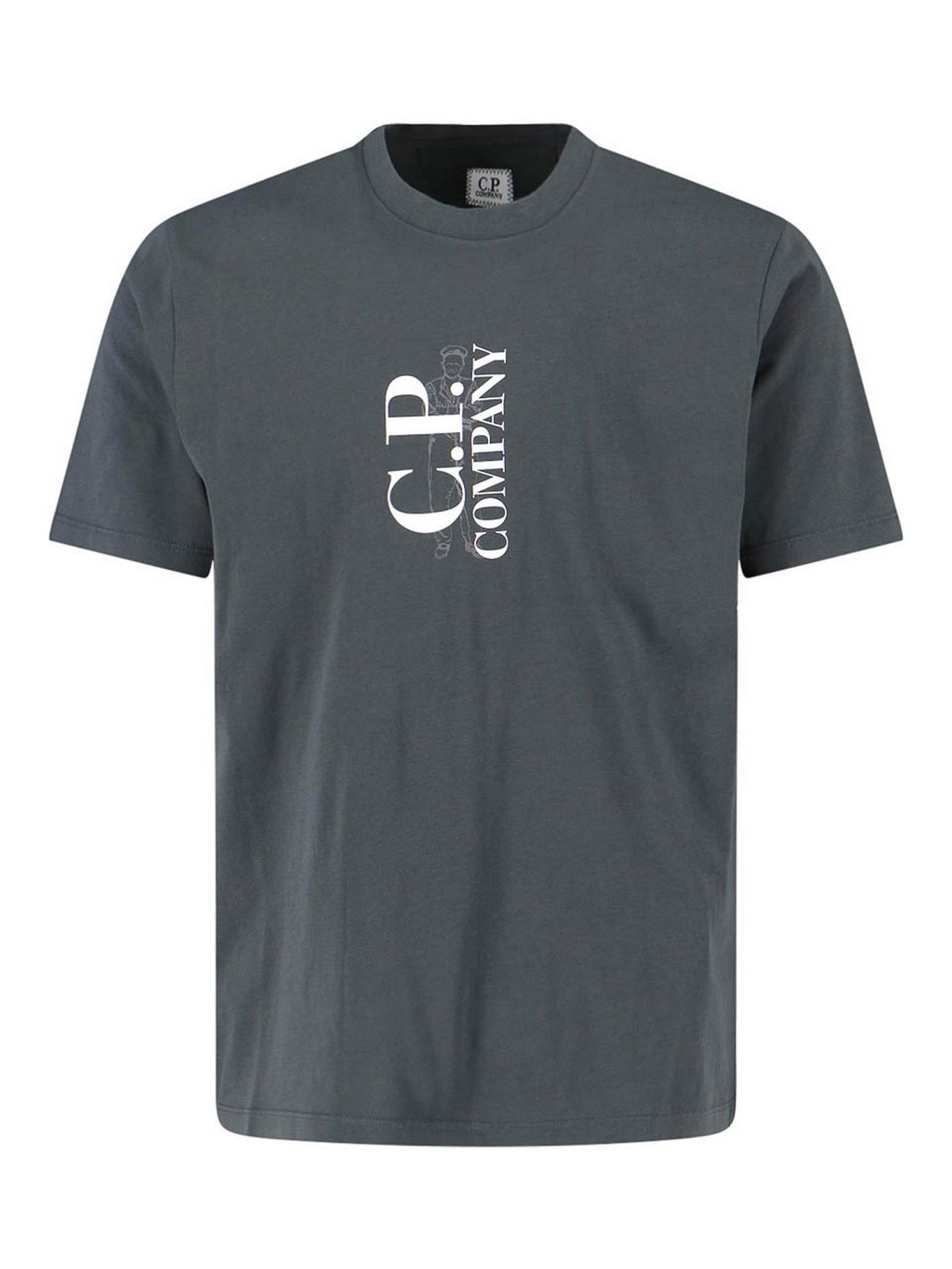 c.p.company ロゴ入りTシャツ、グレーコットン、ジロコロ、マニーチェコルテ、フロントコントラストカラーのマキシロゴ、オーロドリット
