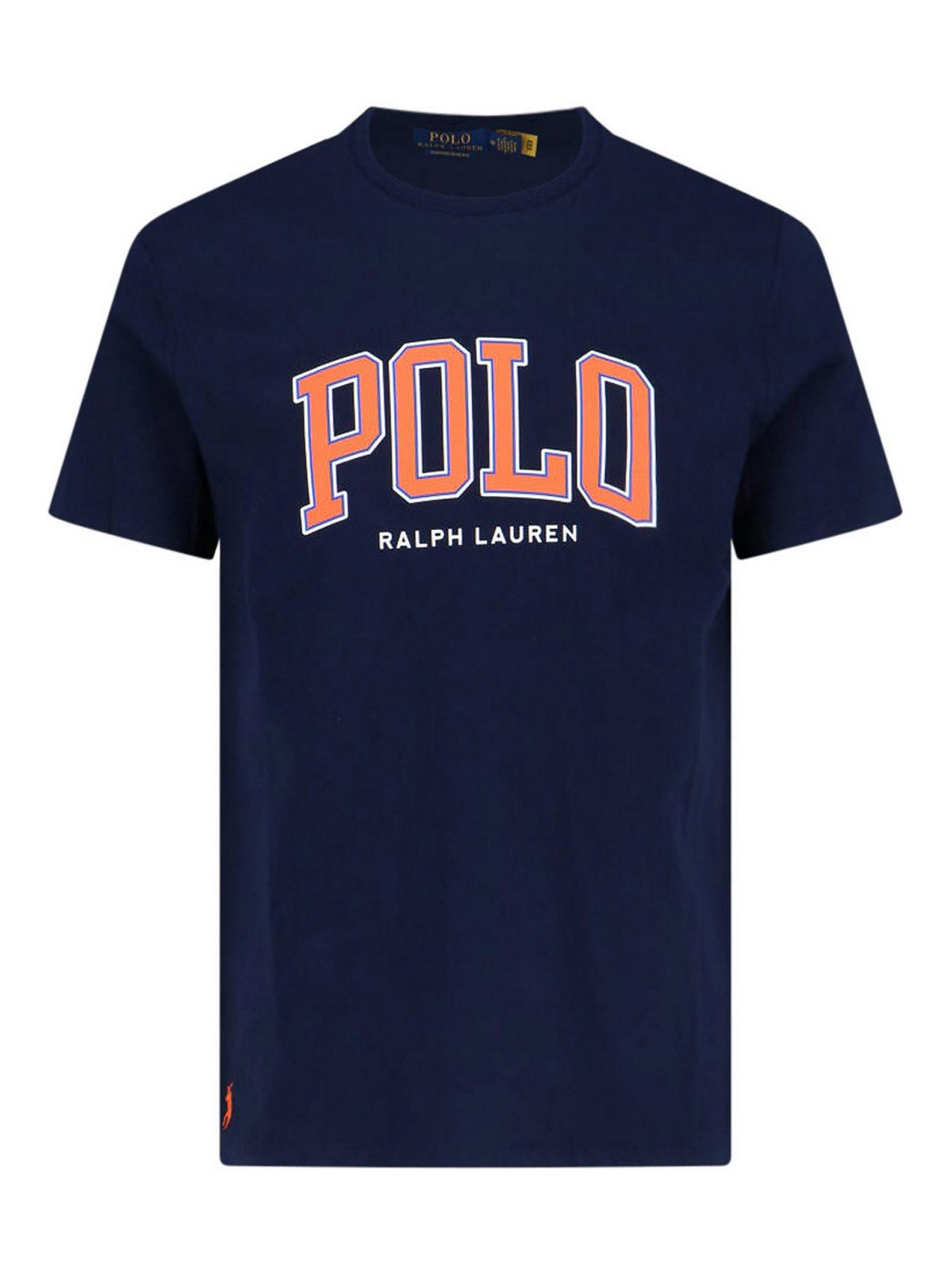 Tシャツロゴポロラルフローレンブルートナリータネイビージロコロスリーブコルテコルテプリントロゴアランシオーネフロントロゴアランチョーネラテラルオーロドリット