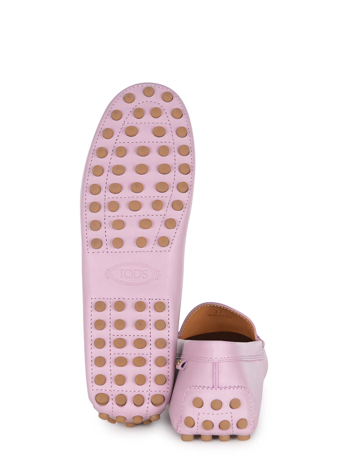 ピンクレザー製トッズローファー、ラウンドトウ、エプロンフロント、レザーライニング、甲に「T」モノグラムエンボス加工、ゴールドカラーのエンボス加工サイドロゴラベル、かかとの後ろにラバーナブ、突起のあるラバーソール、イタリア製 100% レザー
