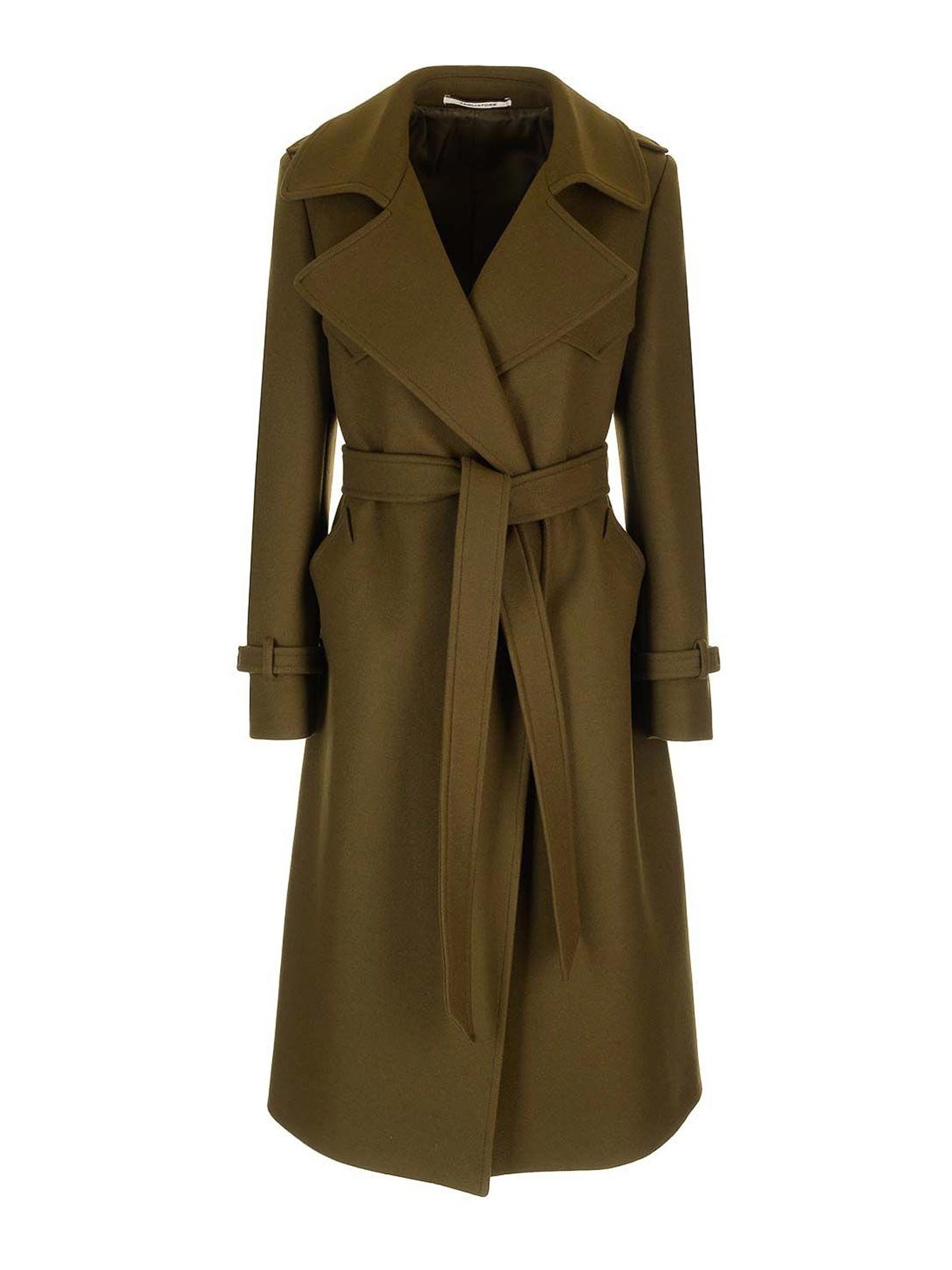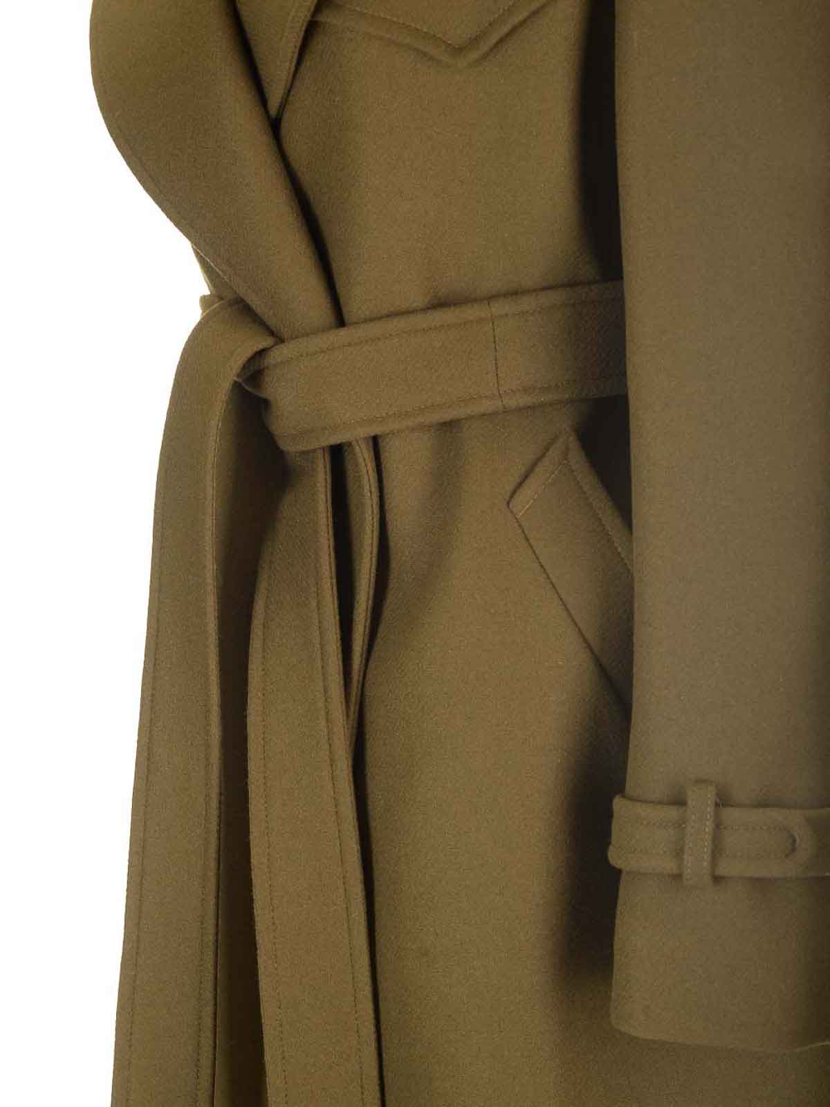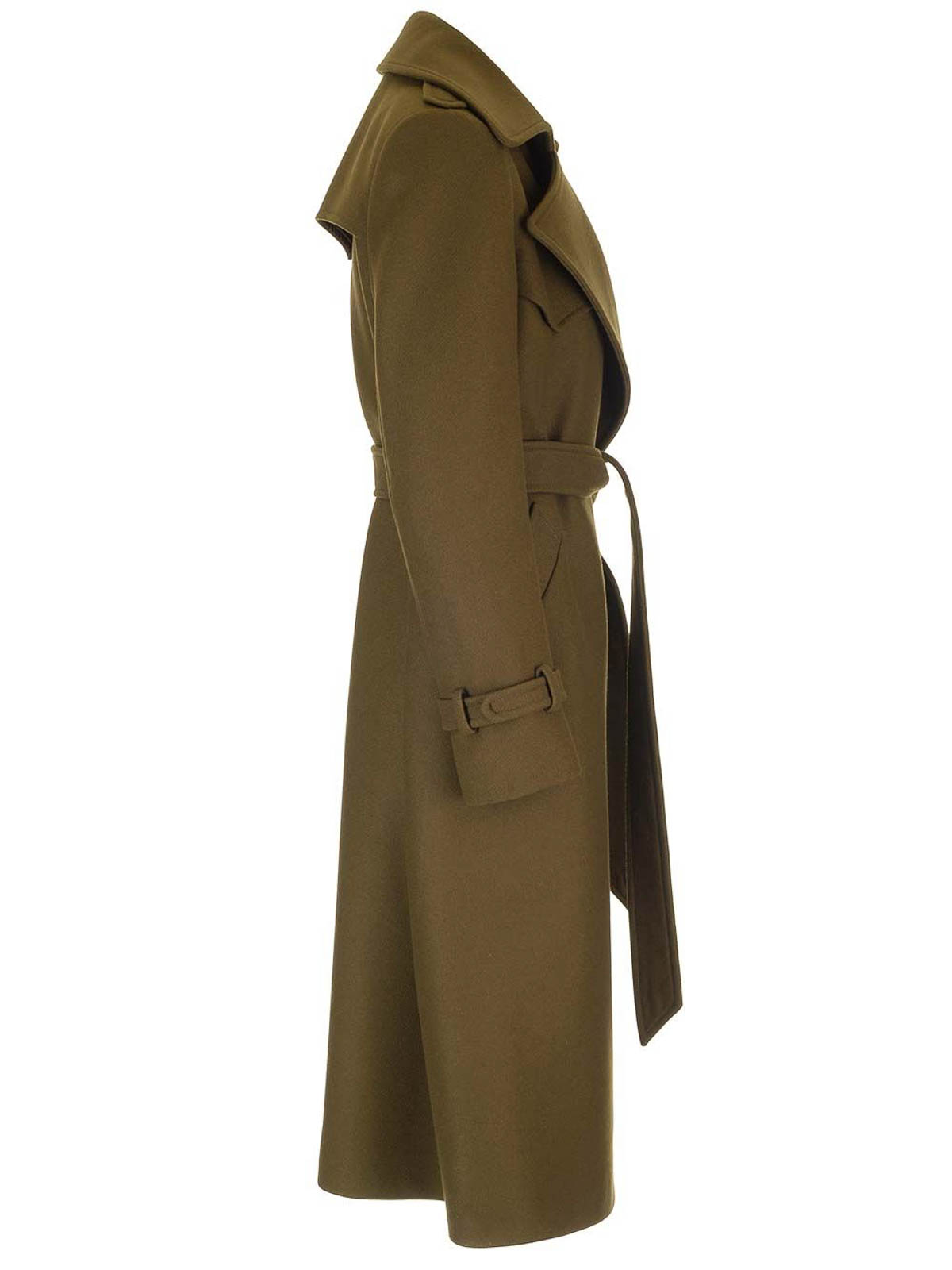 tagliatoreのムスクグリーンのウールを使用したキャロラコート。ベルト、幅広のラペル、2つのサイドウェルトポケット、背面に中央スリットが入ったトレンチスタイル。