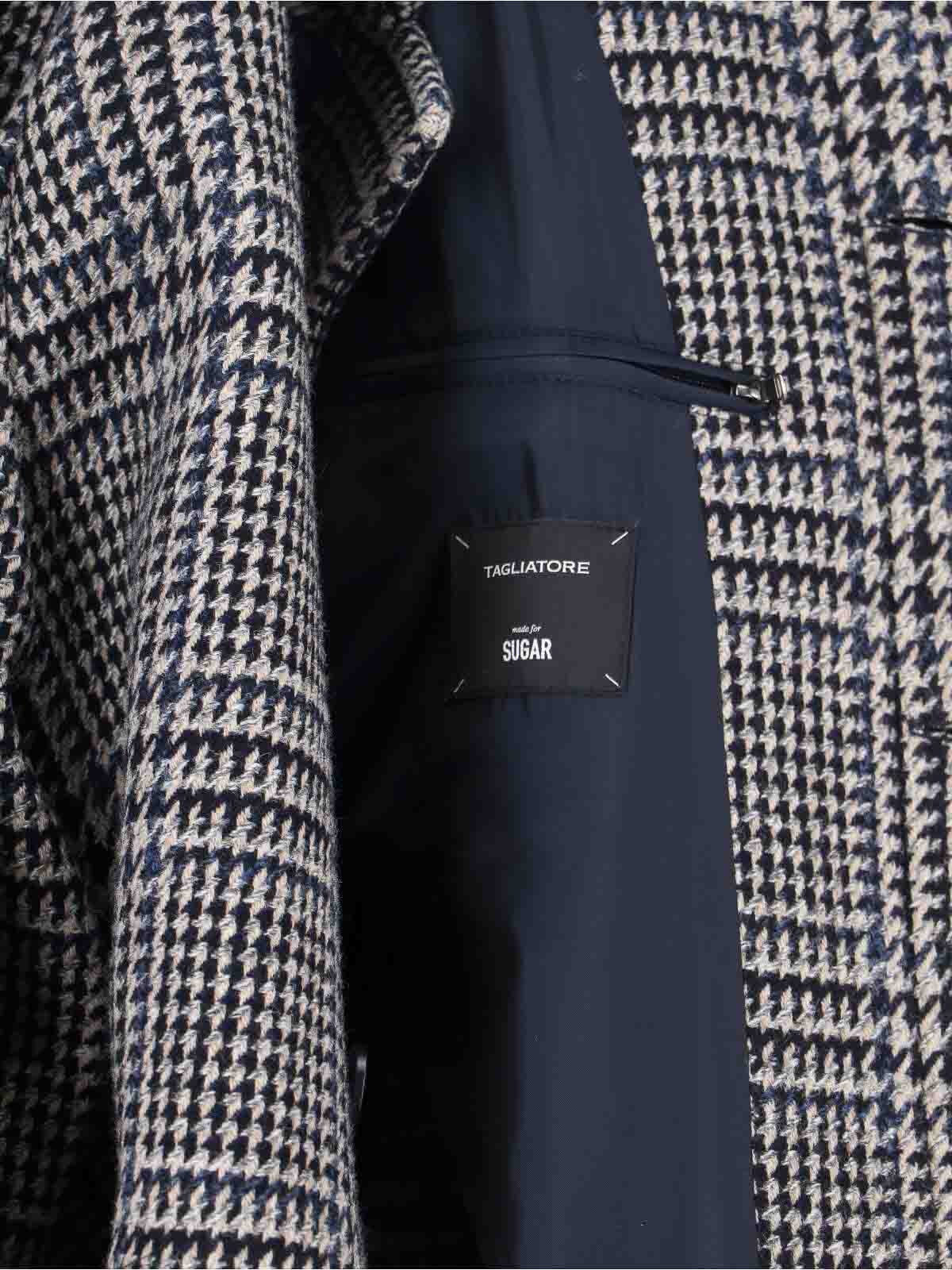 ブラックウールとカシミアの混紡素材を使用したシュガー専用千鳥格子柄のカッターコート。クラシックなラペル、ボタン留め、取り外し可能なベルト、サイドポケット2つ、後ろの裾にスリット、ストレートヘム。
