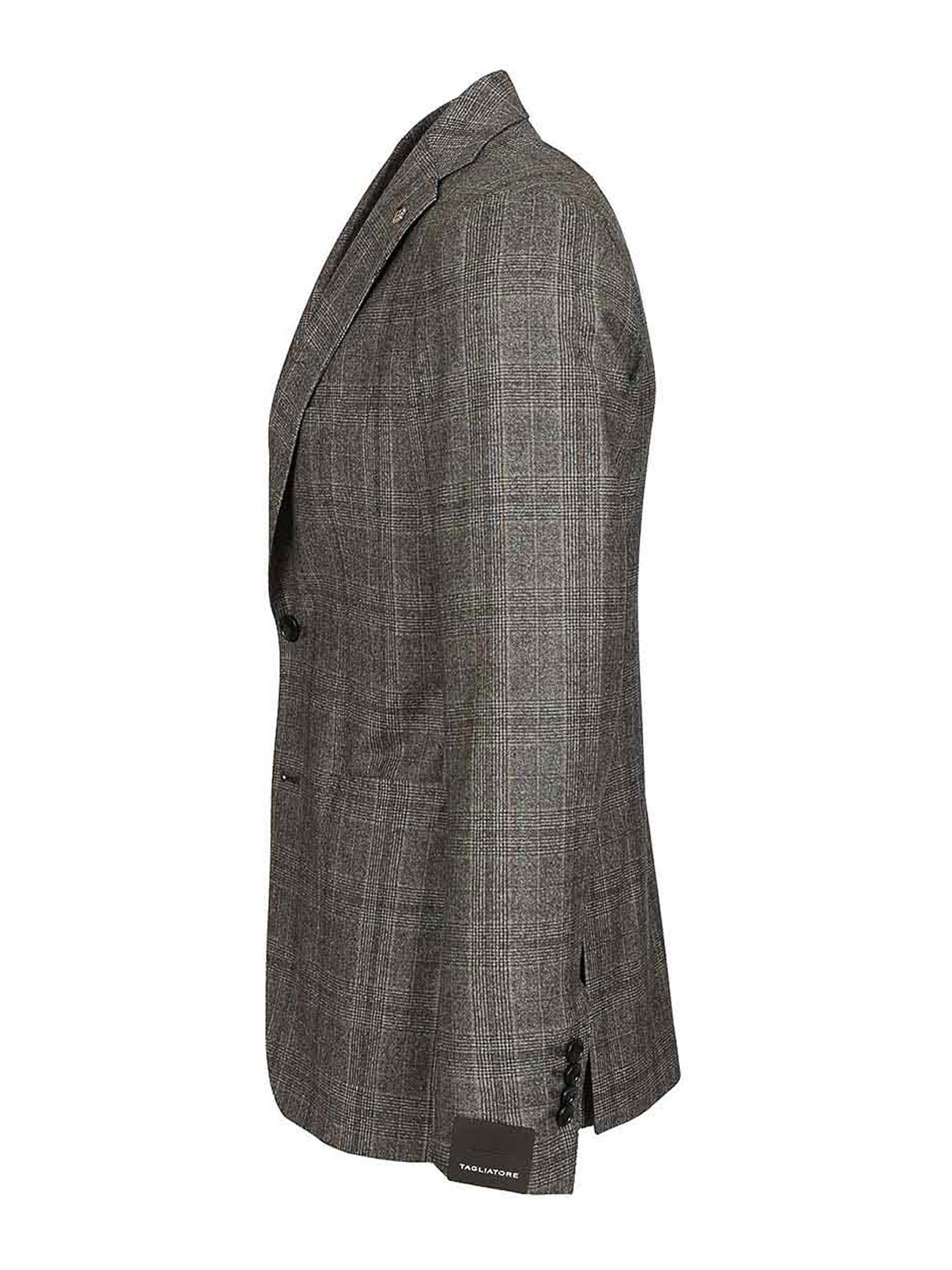 110年代ウールのモンテカルロプリンスオブウェールズスーツ、シングルブレスト、ボタン2つ、パッチポケット、裏地なし、背面に通気口2つ、プリーツ付きパンツ