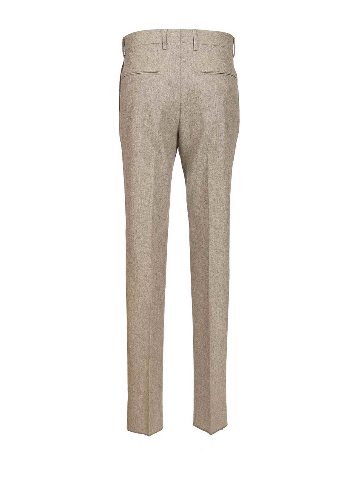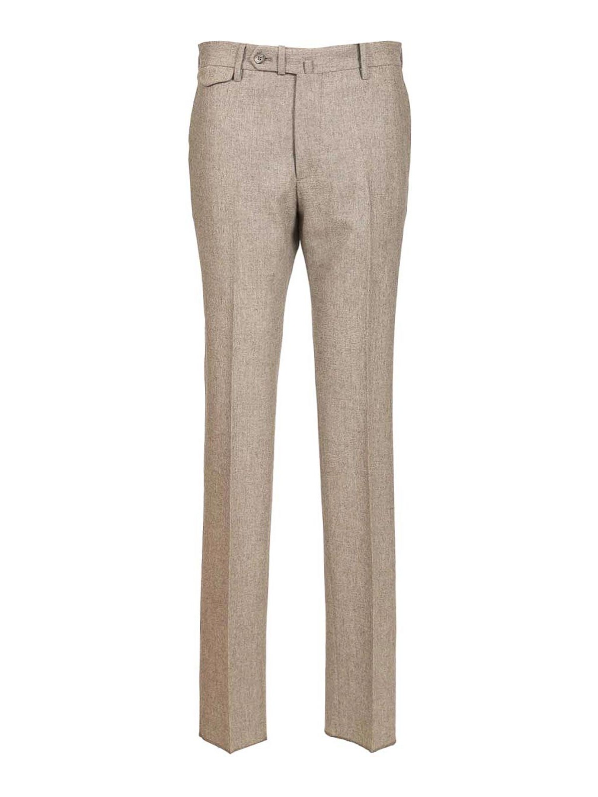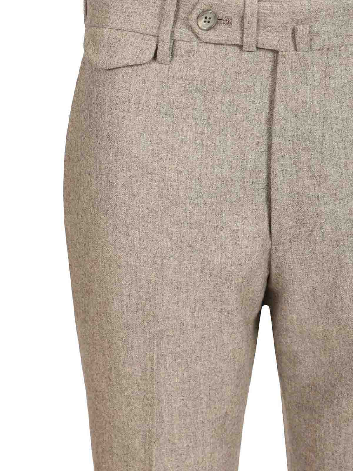 スーパー100年代ウールフランネルのプリーツ付きパンツ。バレルとジップファスナー、サイドウェルトポケット、バックウェルトポケット