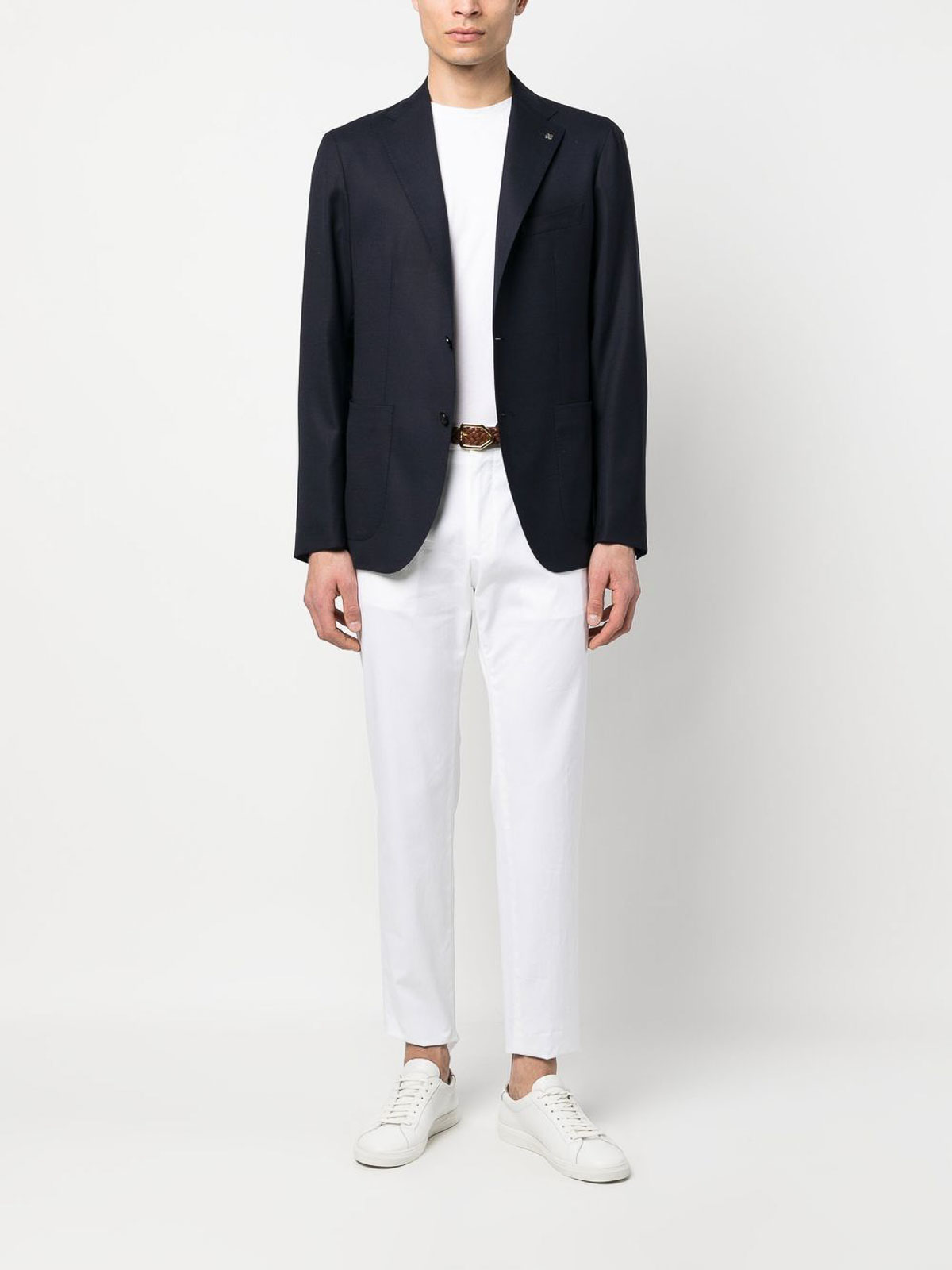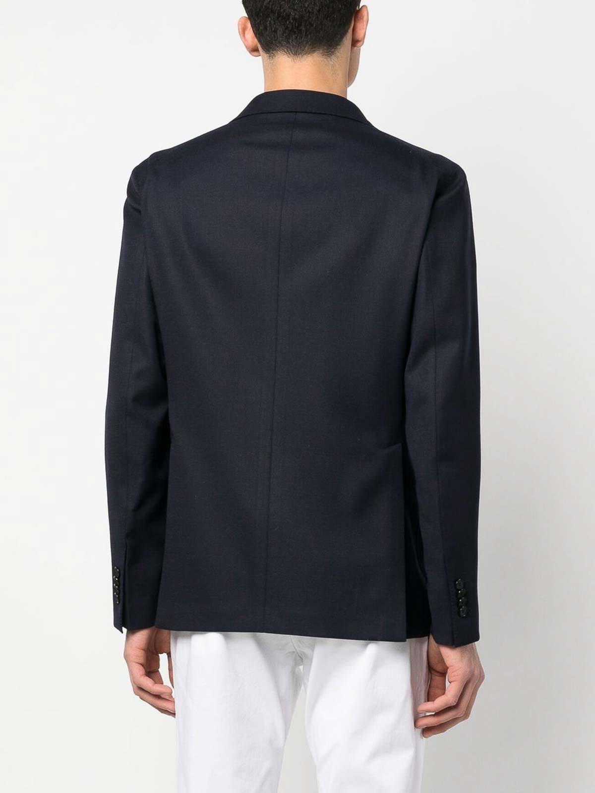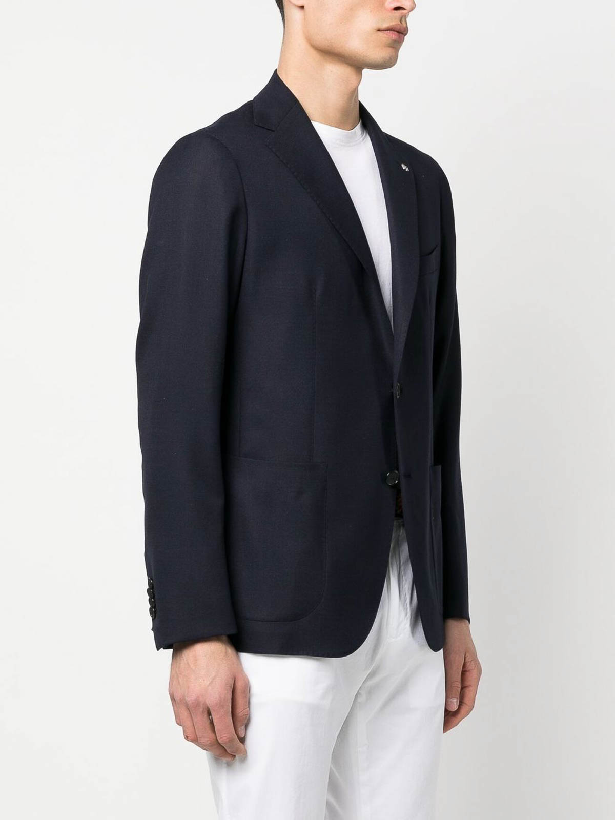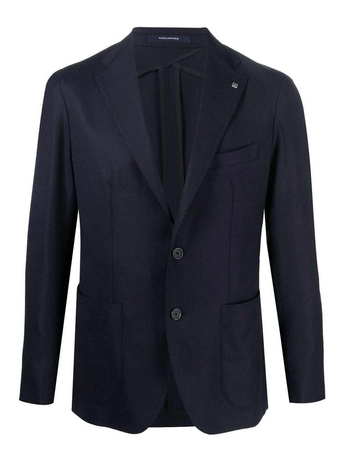 イタリア製のストレッチウールを使用したtagliatoreのミッドナイトブルーのシングルブレストブレザー。クラシックなラペル、フロントボタン留め、ピンディテール、胸元ウェルトポケット、フロントパッチポケット2つ、ボタン付きカフス、ダブルバックベントが特徴で、洗練された現代的なテーラリングのエレガンスを醸し出しています。