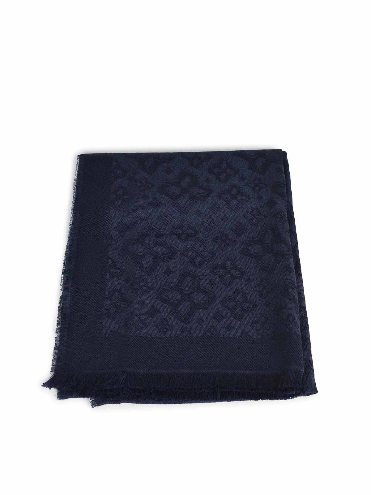 ネイビーブルーのジャカードウールのタリアトーレスカーフ。表面全体にトーン・オン・トーンのロゴ。縁にフリンジ付き。180 cm x 52 cm。100% ウール。イタリア製。
