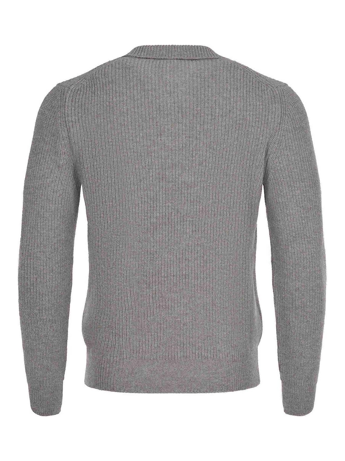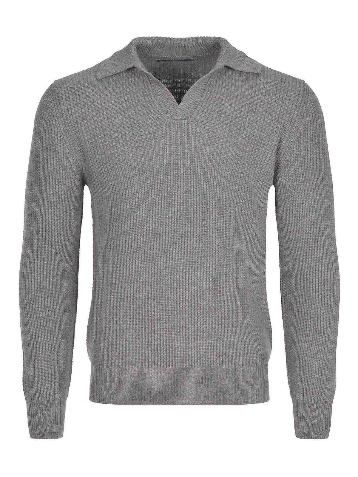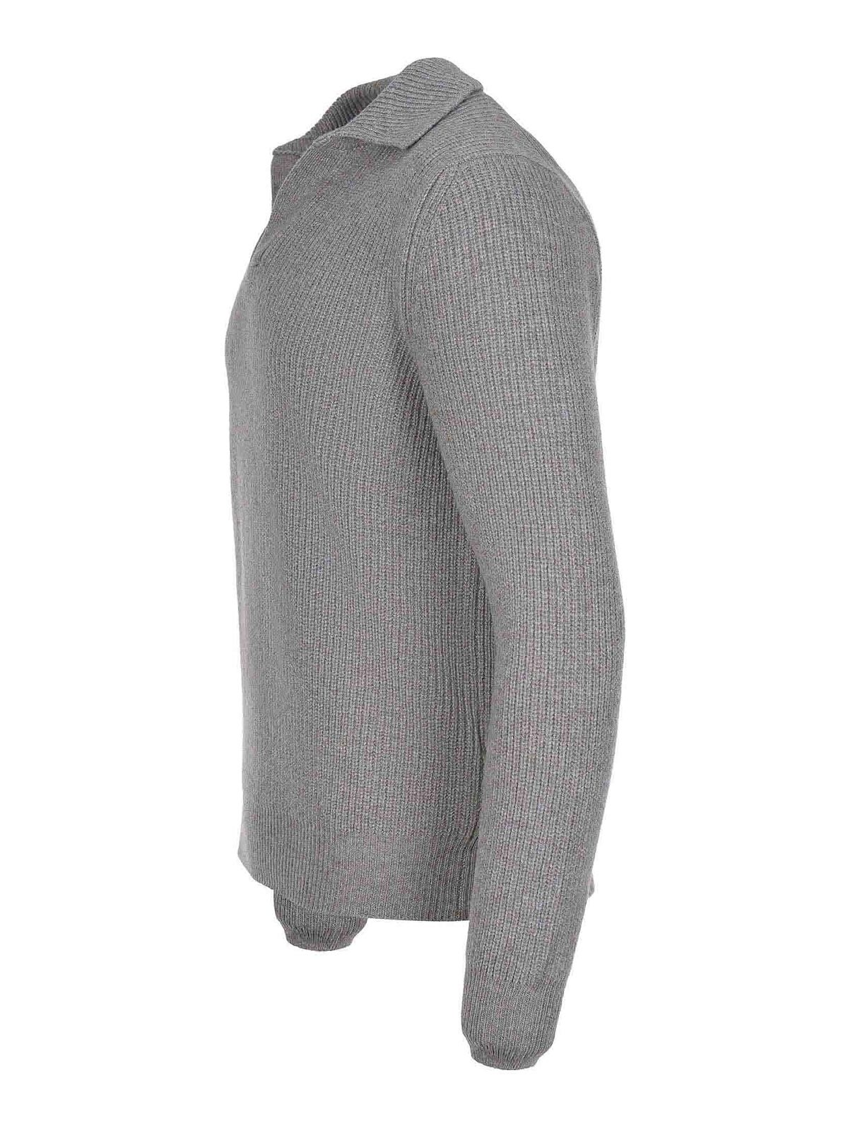 グレーウール製のポロタリアトーレ。クラシックカラー。Vネック。長袖。リブ編みの袖口と裾。100% ウール。イタリア製