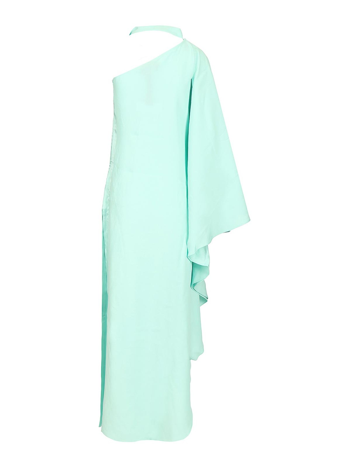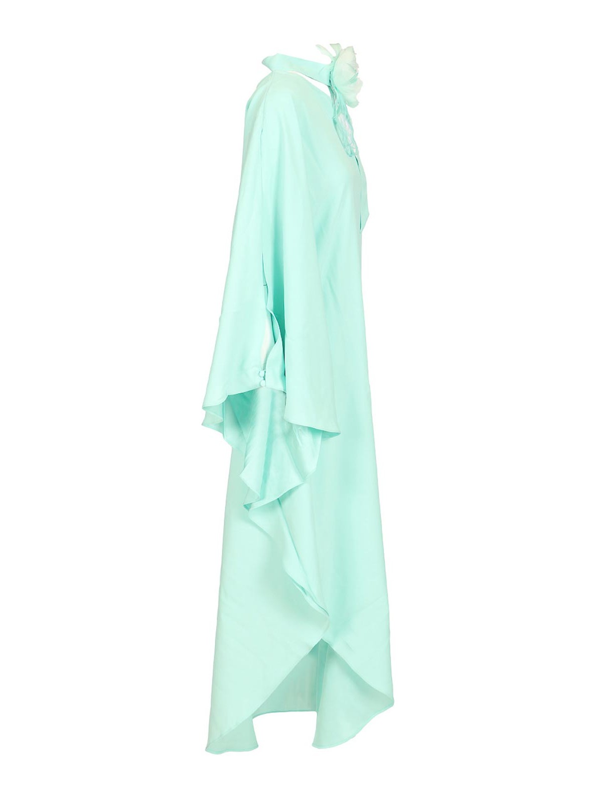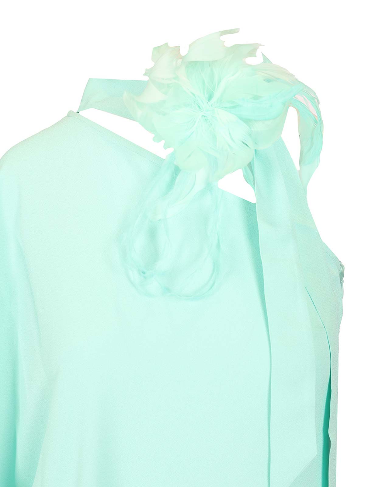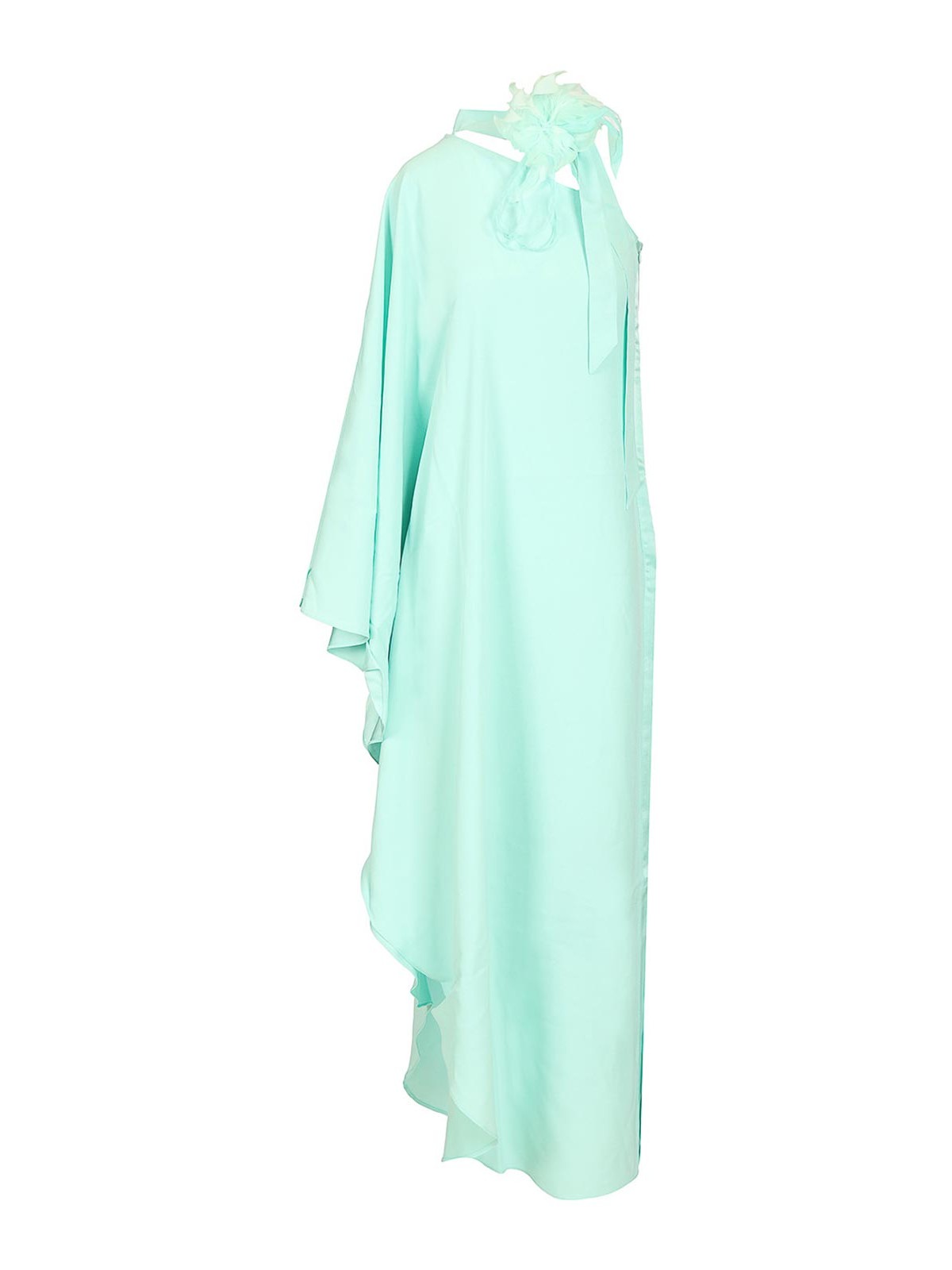 Taller marmoのクレープキャディのボルカンガーデンドレス。太ももの高さのスリットと袖にスリットが入っています。ワンショルダーにはスカーフのネックラインが付いており、首元にはダチョウの羽の花が飾られています