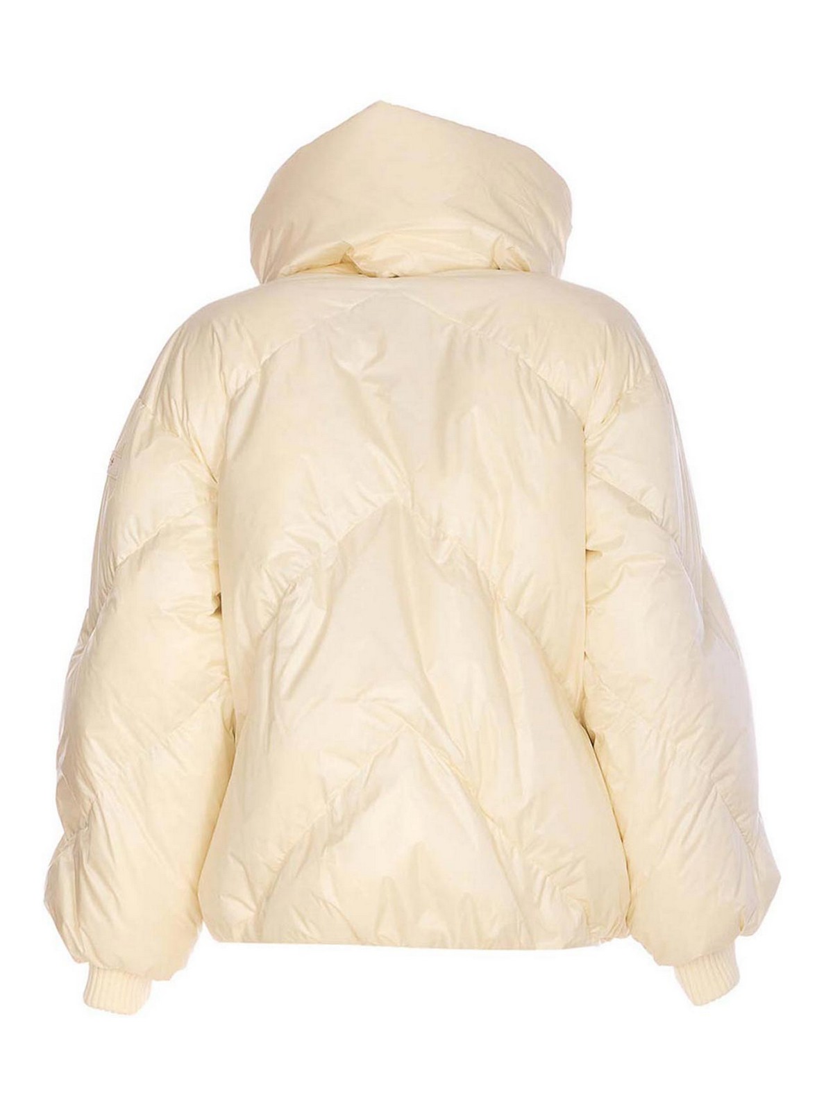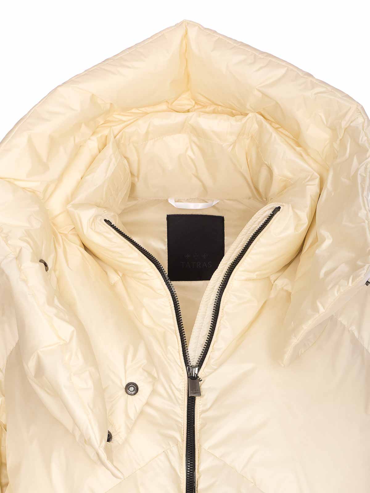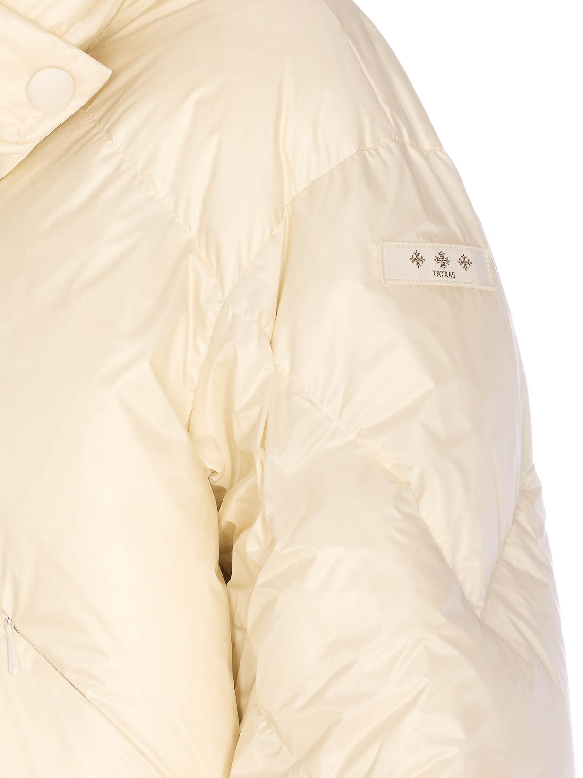 Tatras ホワイトエケベリアダウンジャケット、前面ファスナー開閉、ファスナーポケット、側面パッチロゴ、ハイネック、取り外し可能な襟のディテール、パッド入り