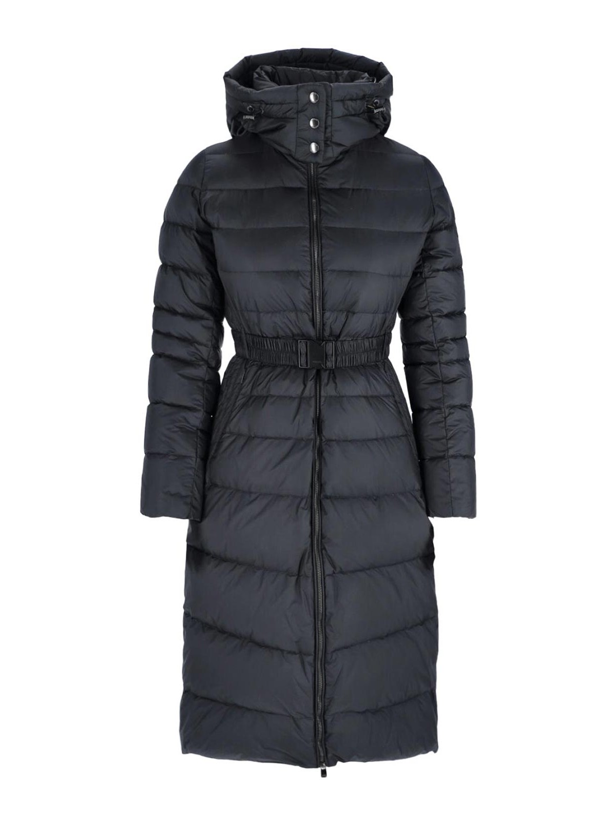 タトラスヘリコニアロングダウンジャケット、ブルー生地、パッド入りデザイン、ドローストリングフードとボタン、ジッパー開閉、伸縮性ウエスト、長袖、サイドポケット、ストレートヘム。