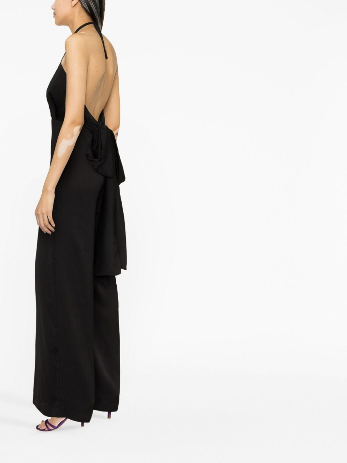 pinkoのブラックホルターネックオープンバック「テネロ」ジャンプスーツは、黒のホルターネックのネクタイ留め、オープンバックで結んだウエストリボンのディテール、ワイドレッグサイズが特徴です