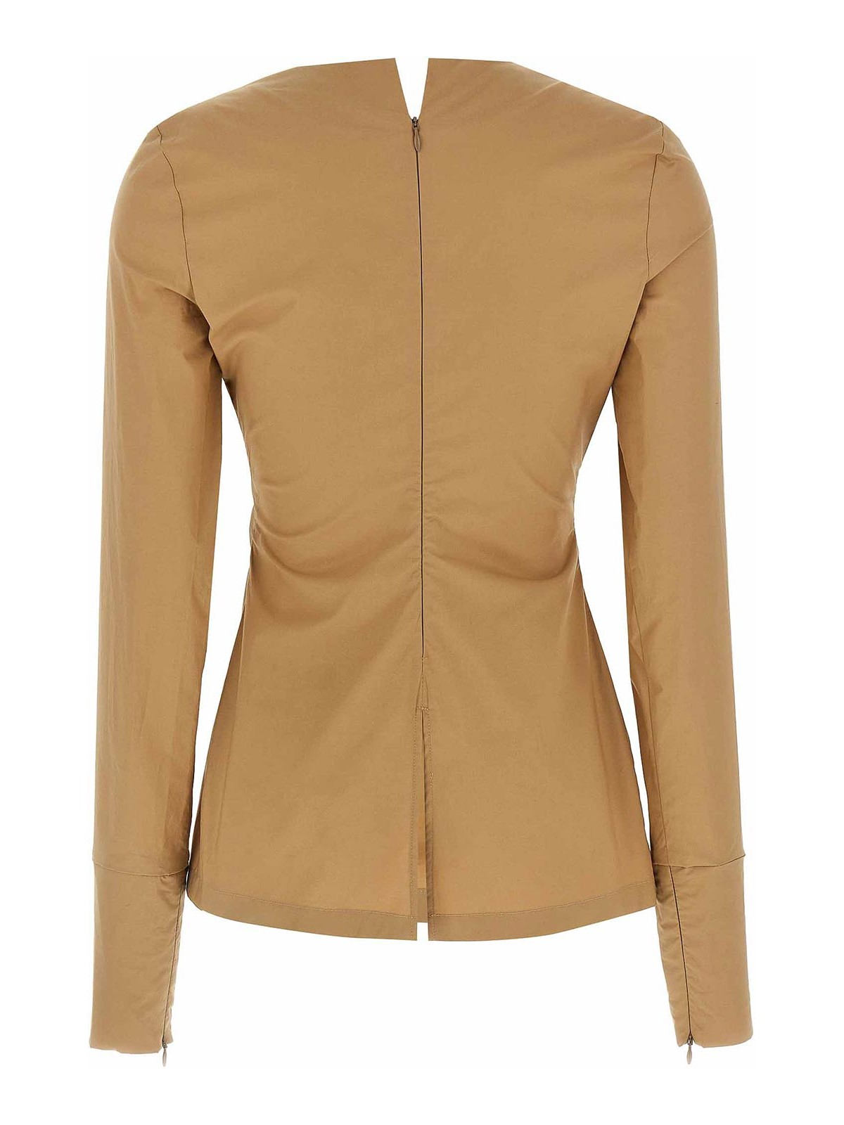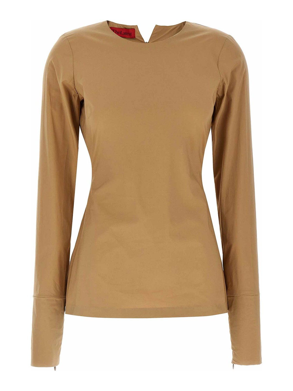 テリーのポプリン T シャツラウンドネックラインロングスリーブ、袖口にファスナー付き、後ろにスプリット付き