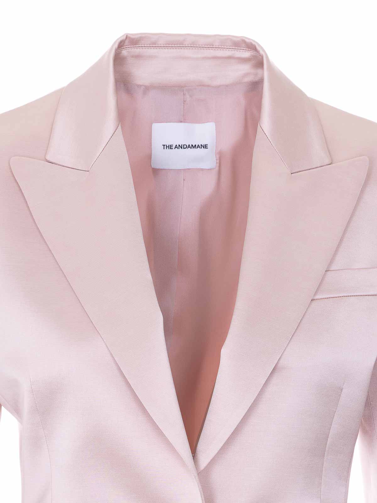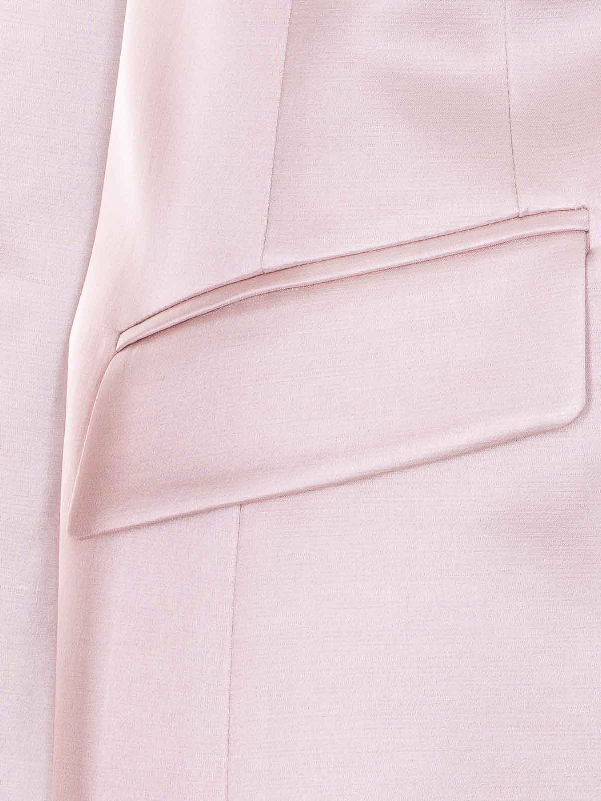 アンダマンペタルローズビアンカブレザー、Vネック、フロントワンボタンクロージャー、パッド入りショルダー、フロントポケット、VLラペル、シャイニーエフェクト