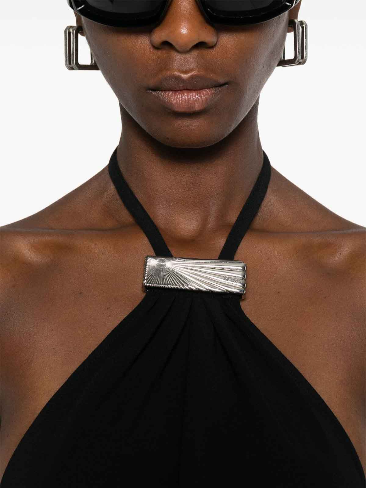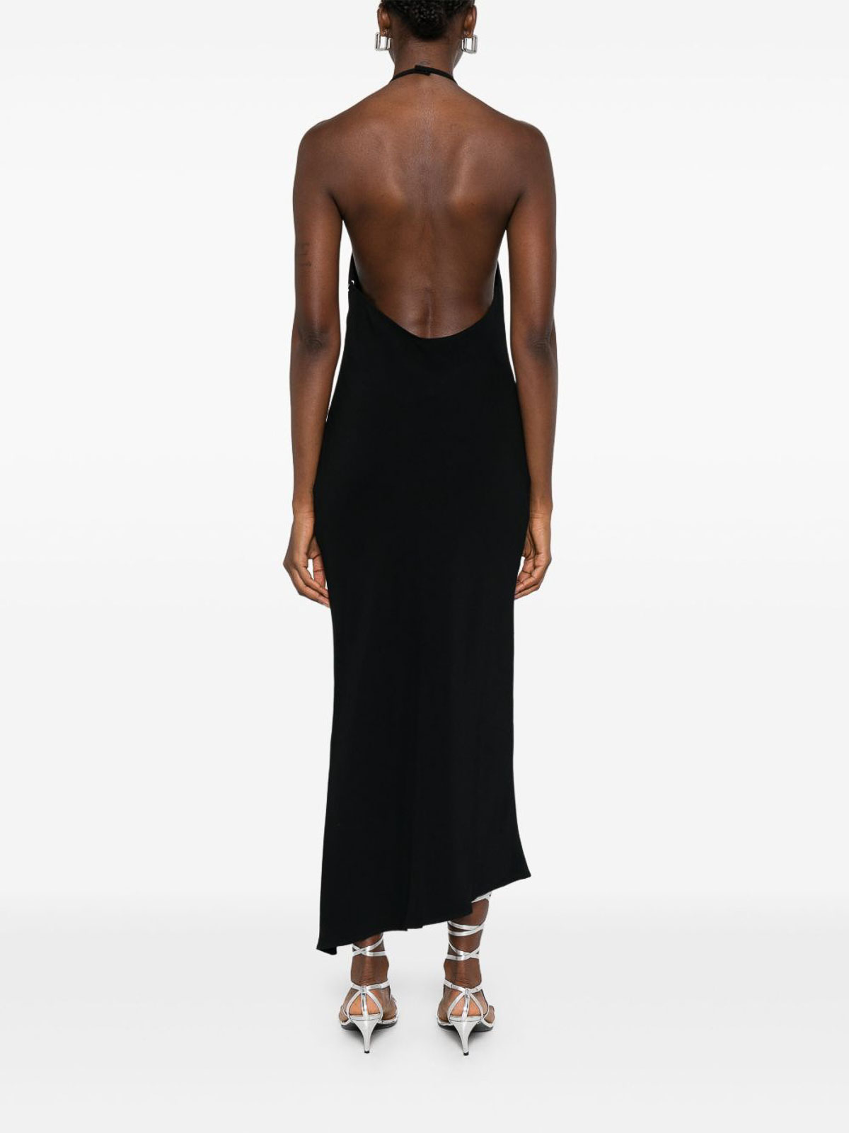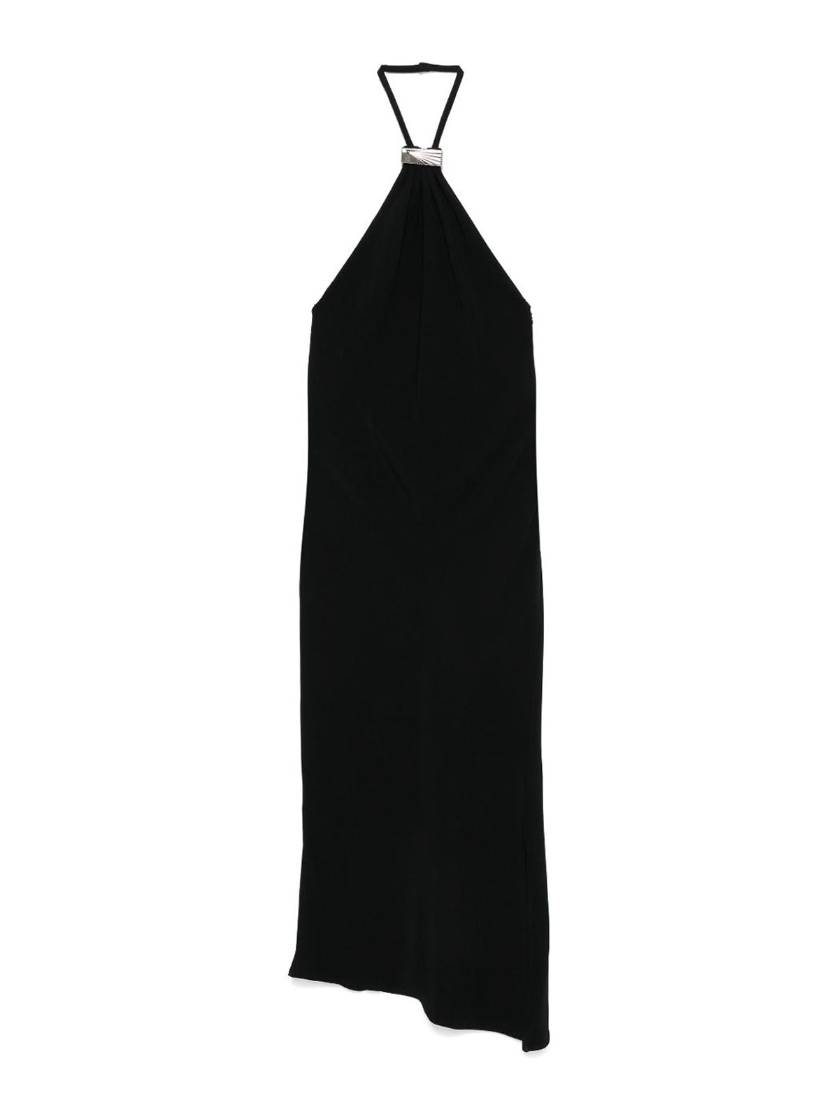 屋根裏にホルターネックをあしらったミディドレスは、クラシックな黒、ノースリーブ、裾がアシンメトリーなミディドレスです。このミディアム丈の衣服は、サイドの隠し留め具が特徴で、完璧で洗練されたフィット感に最適で、特別な機会や洗練されたルックスに最適です。アティコ、ホルターネックのミディドレス、黒、流れるような生地、ノースリーブ、隠しサイドファスナー、アシンメトリーヘム、ミディアムレングス