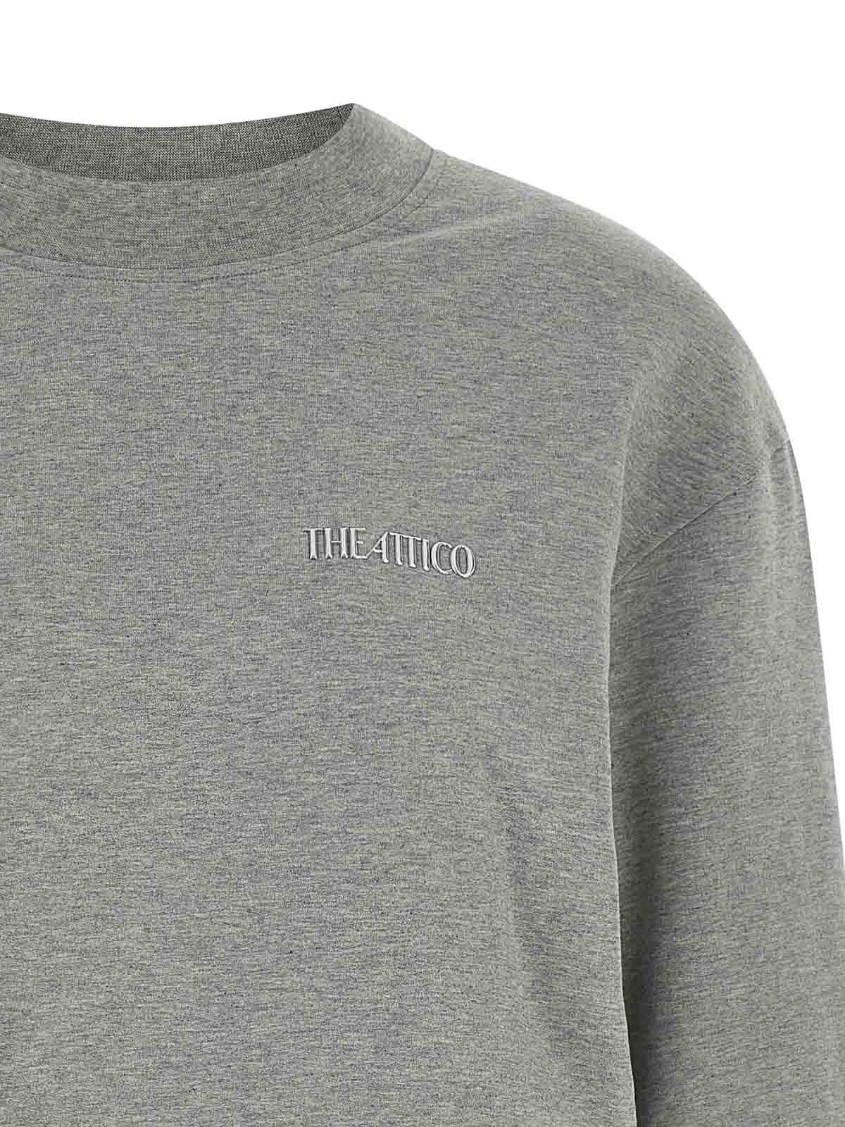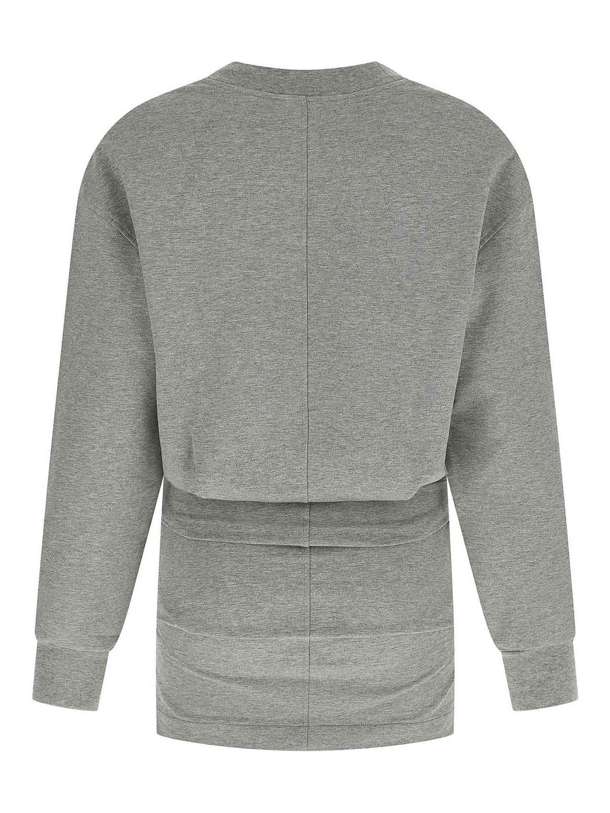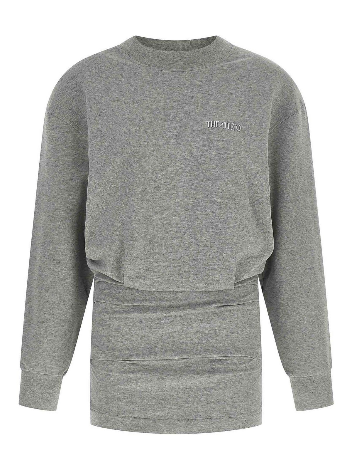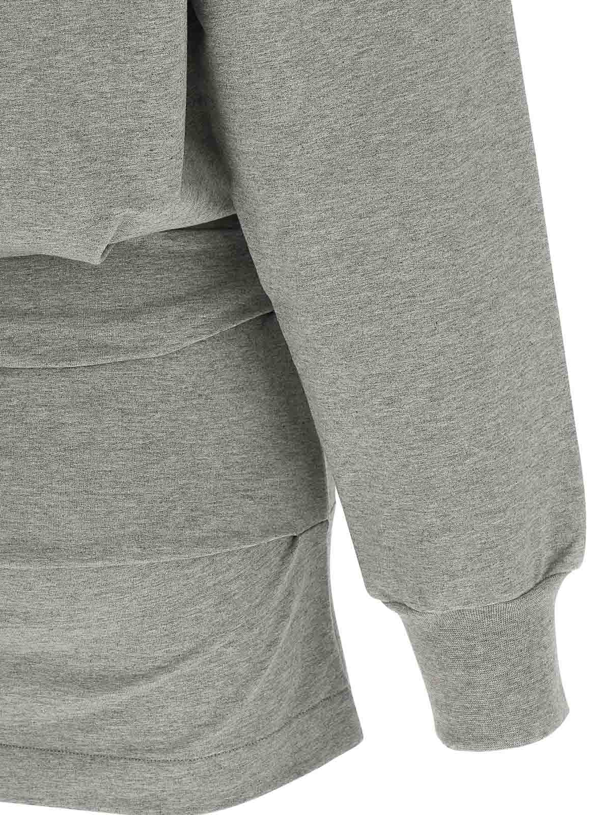 起毛加工コットンドレス、オーバーサイズのスウェットシャツ、ドレープミニスカート、フロントにトーン・オン・トーンのメタルロゴ、クルーネック、カフス付きロングスリーブ。