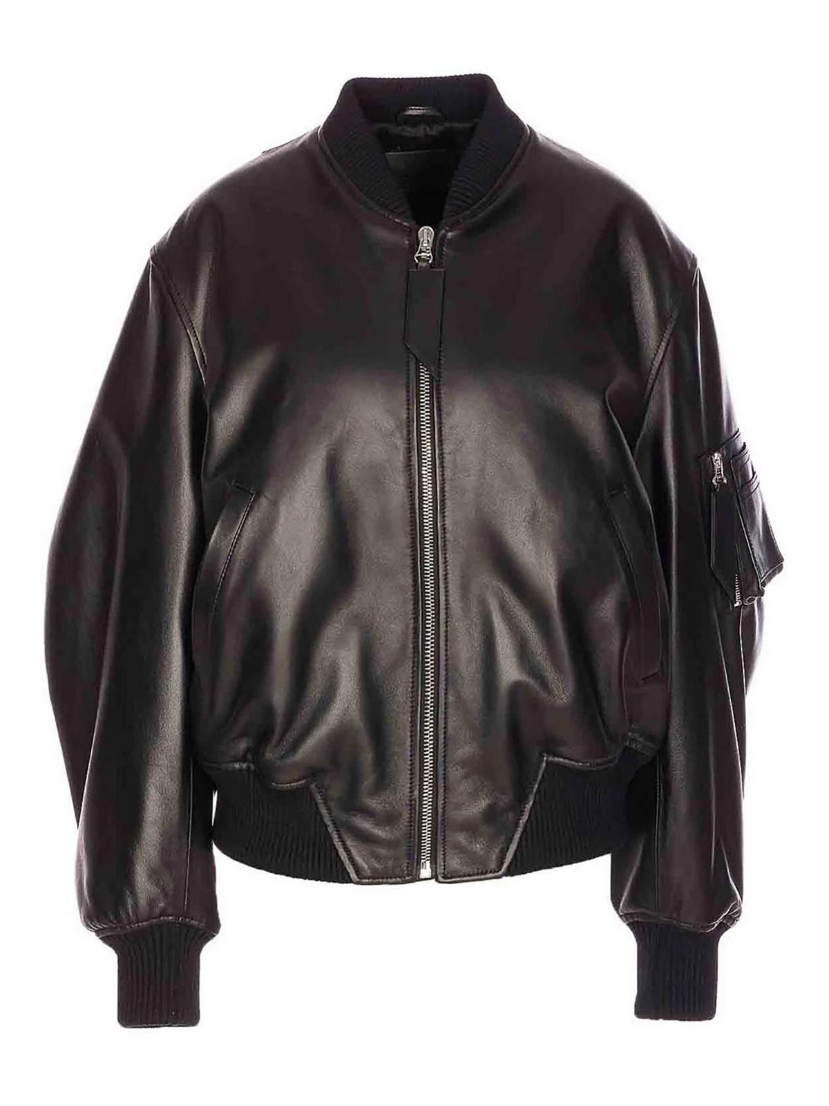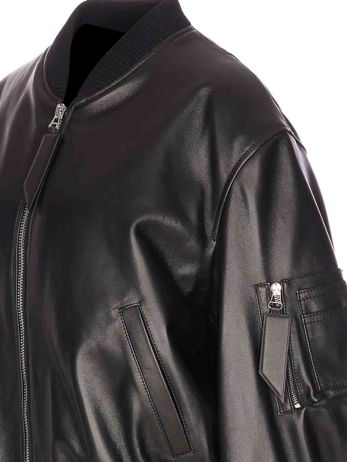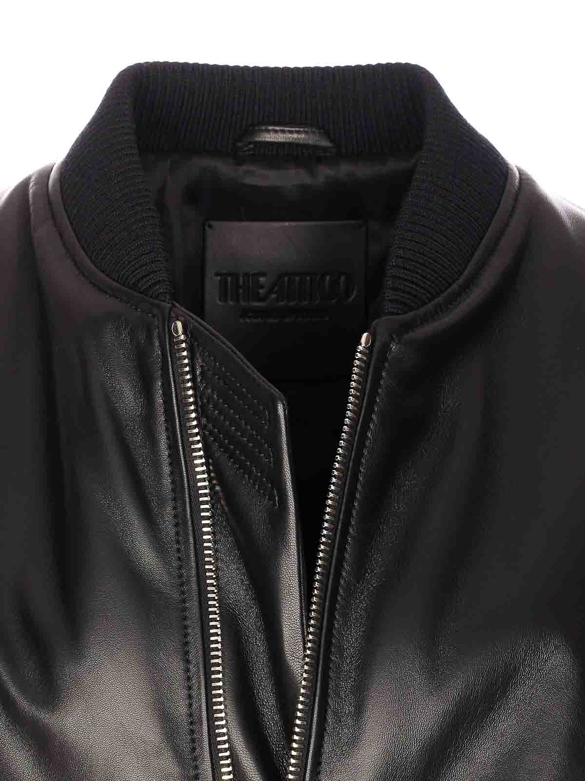 ジッパー付きアティコブラックレザーボンバー、長袖、袖口、襟、ウエスト、横ポケット、袖ポケット