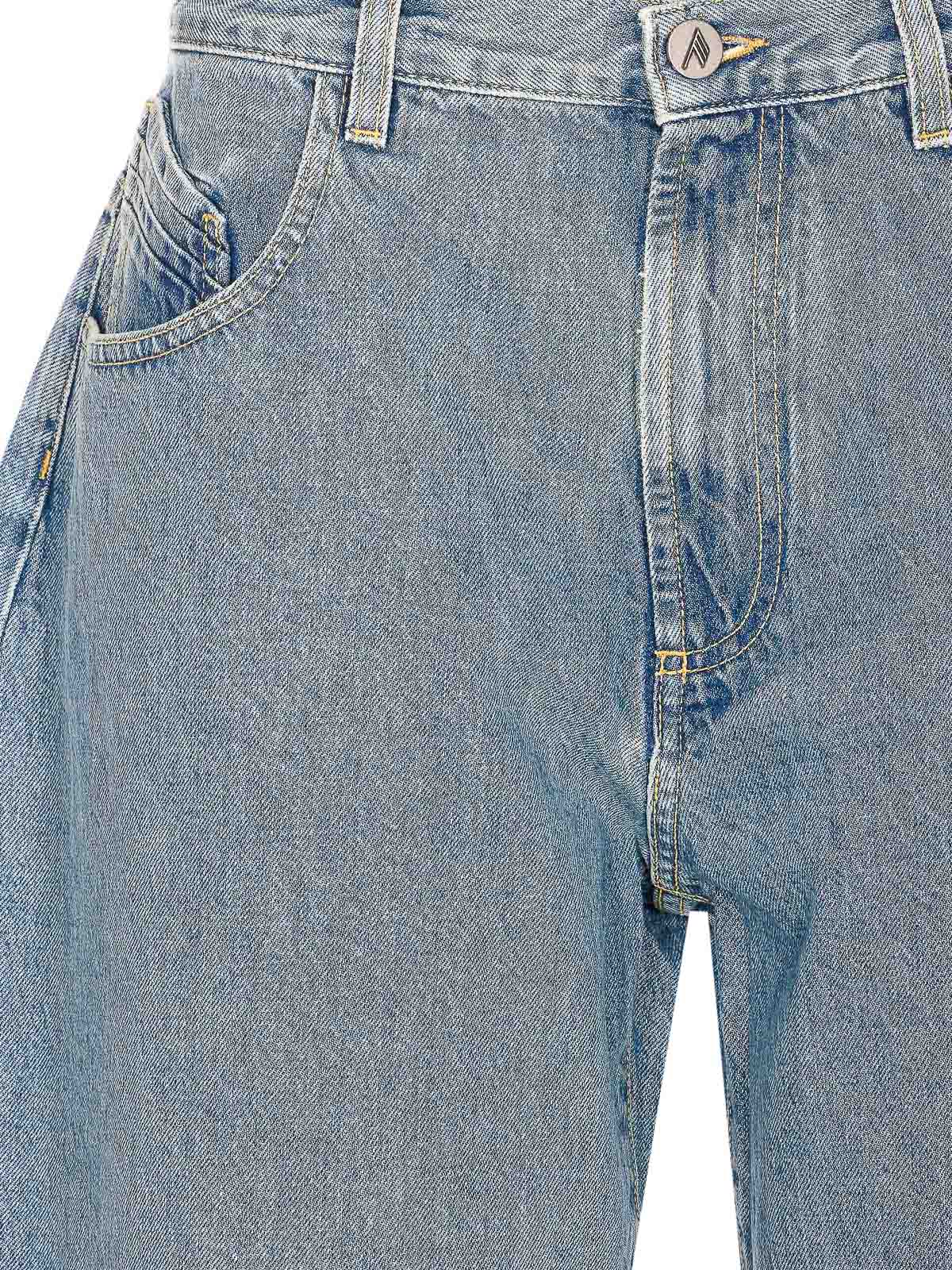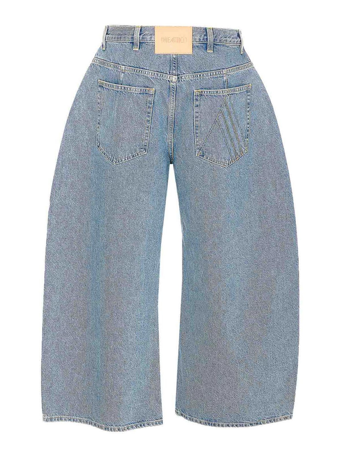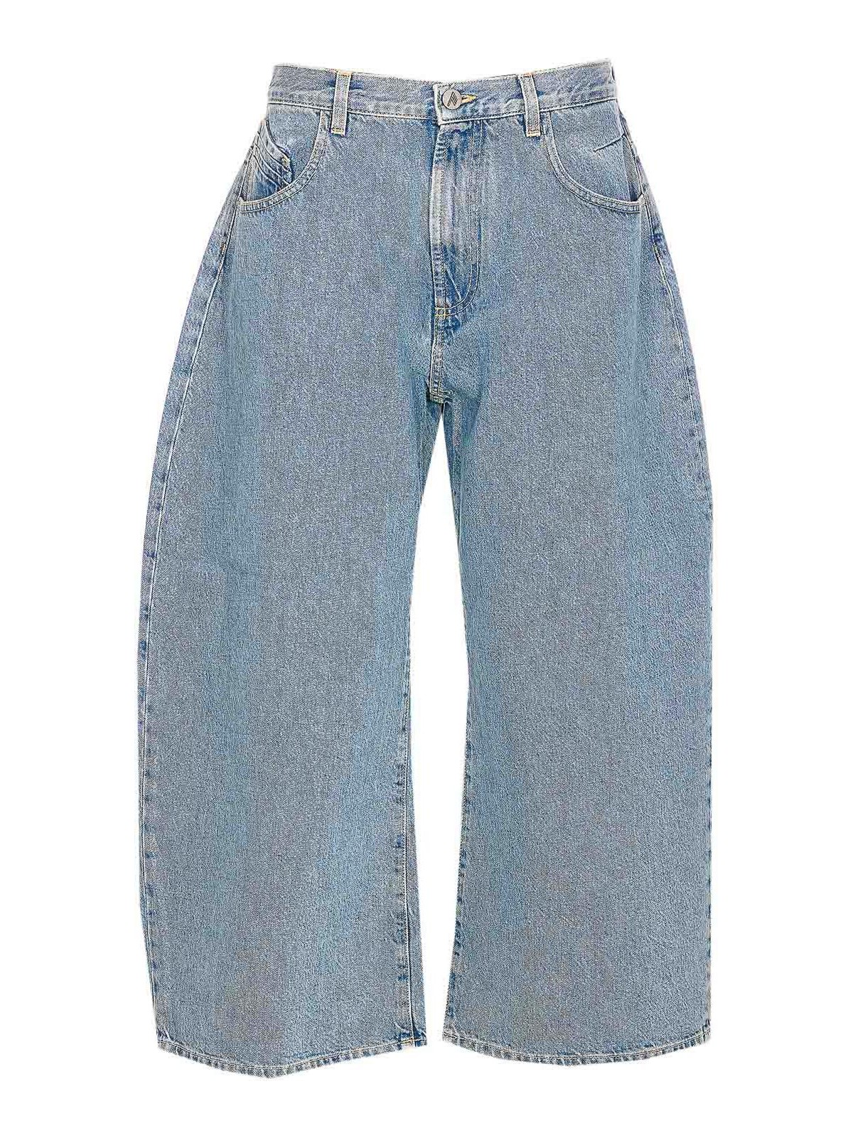 アティコスカイブルーデニムショーツ、ロゴボタンとジッパー、ポケット5つ、背面にパッチロゴ、背面にロゴ刺繍、ルーズフィット