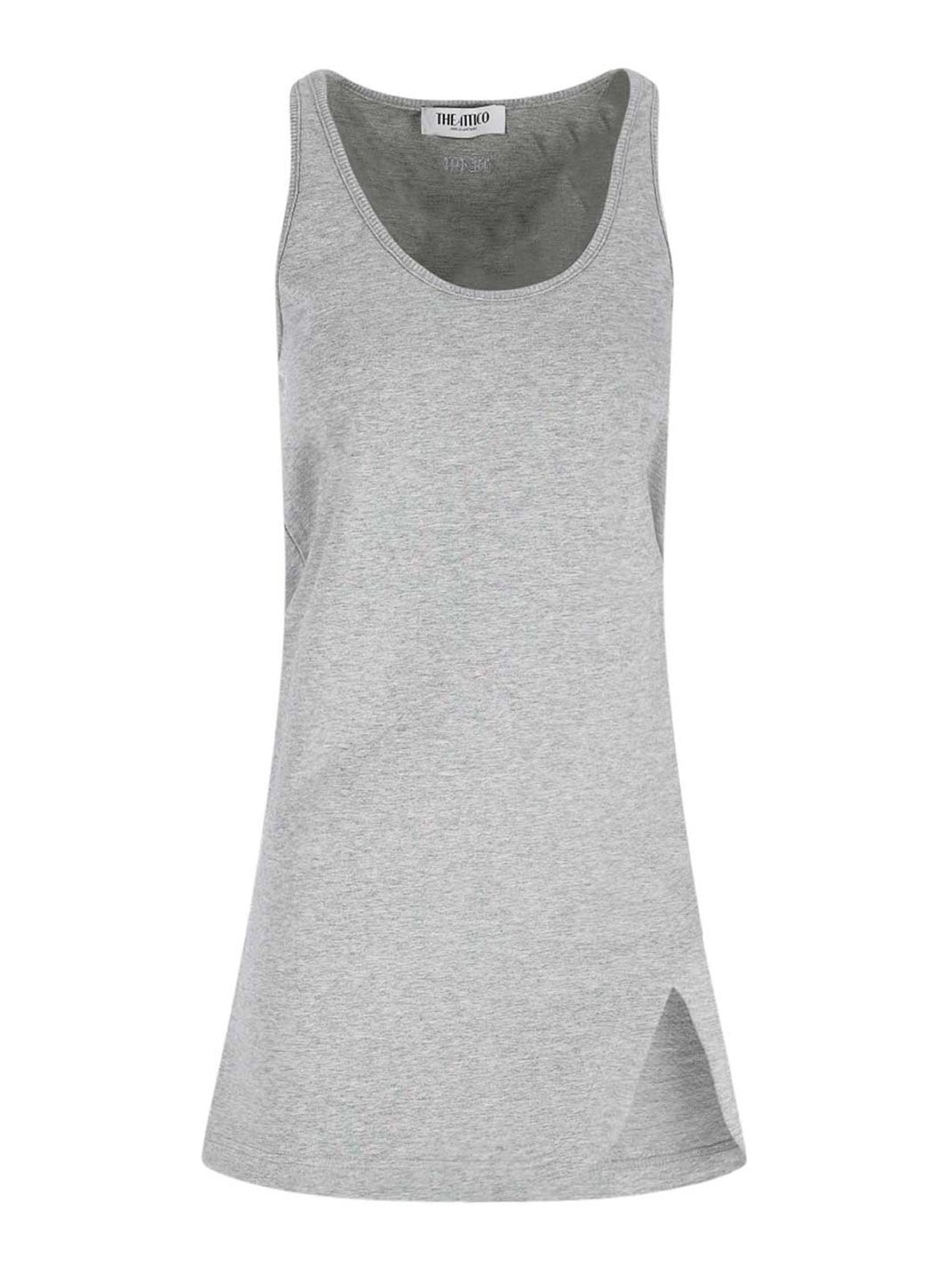グレーのストレッチコットンを使用したアッティコのミニドレス、クルーネック、ノースリーブ、サイドスリットディテール、背面にトーン・オン・トーンのロゴ刺繍、ストレートヘム。