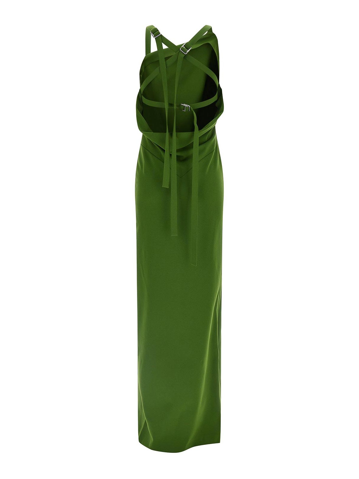 ビスコースとシルク混紡ジャージーのロングドレス、アシンメトリーなフロントネックライン、ノースリーブ、調節可能なストラップ付きのワイドバックネック、ワイドフロントスプリット。