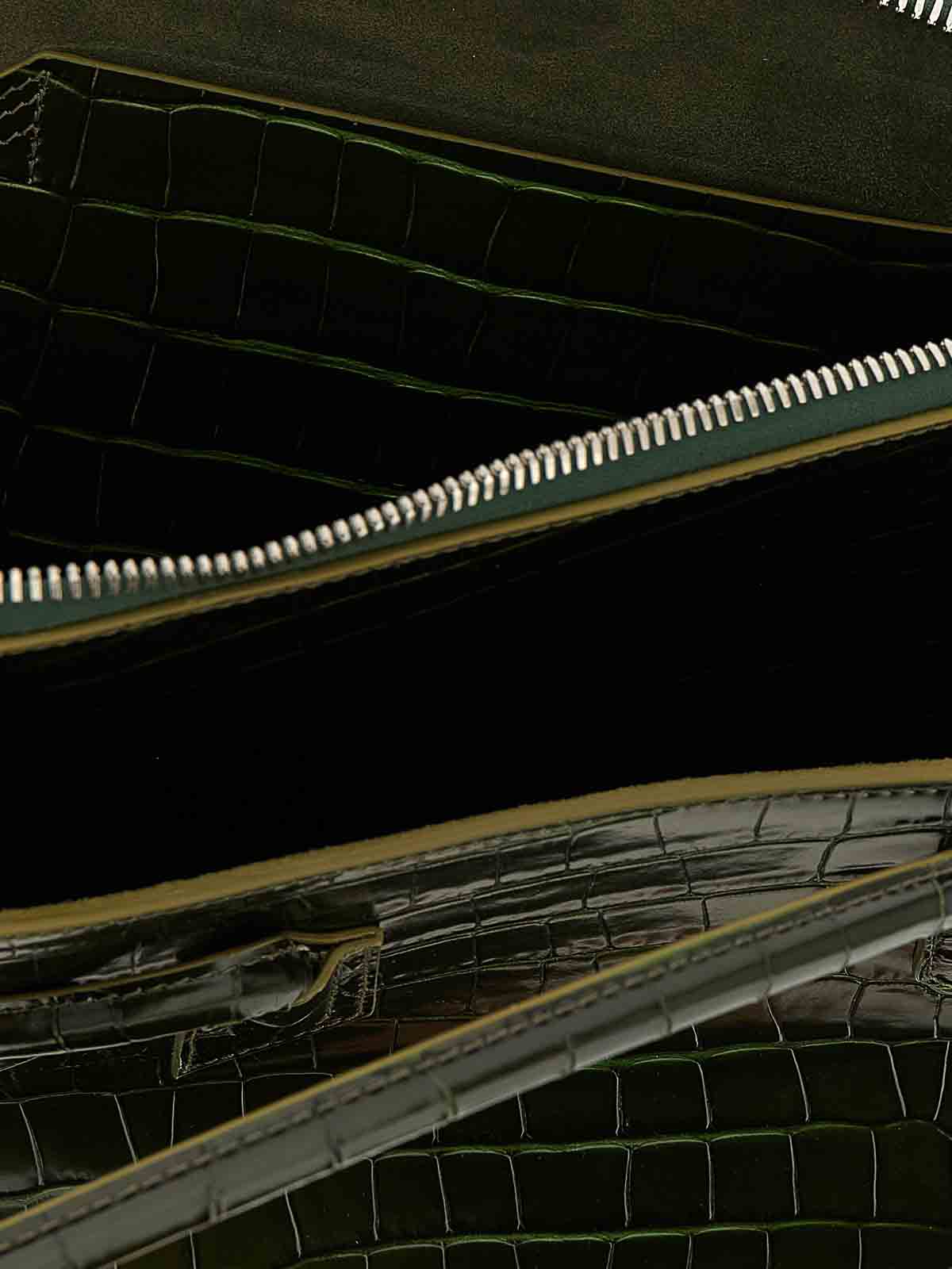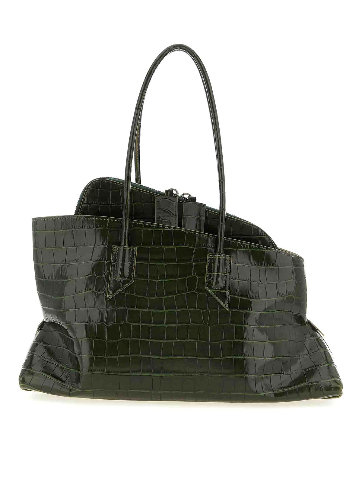 la passeggiata ミディアムサイズのクロコダイルプリントレザーショルダーバッグ、前面にエンボス加工ロゴ、ダブル固定チューブハンドル、上部ファスナー開閉、サイドポケット、金属製のロゴフィートが付いた頑丈なベース。