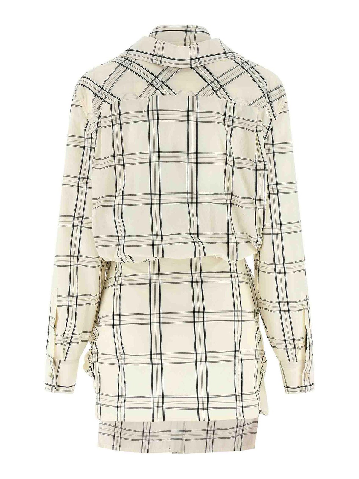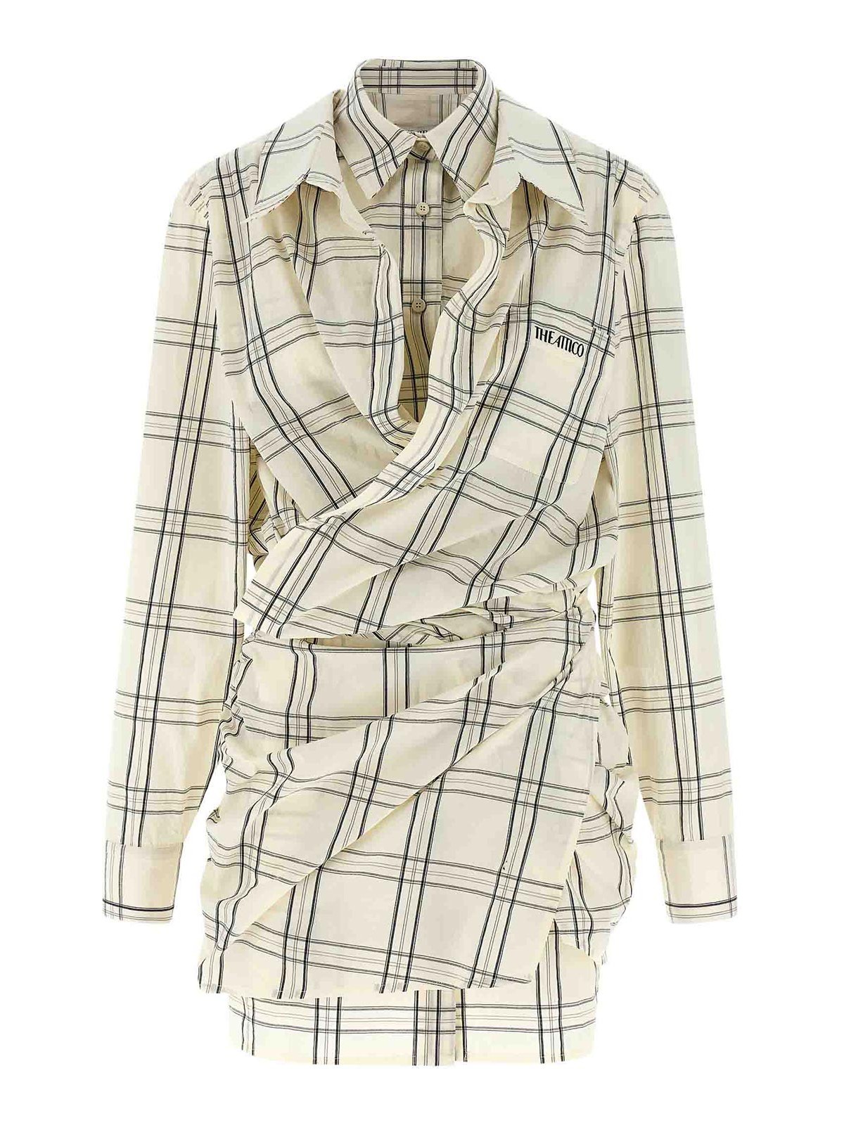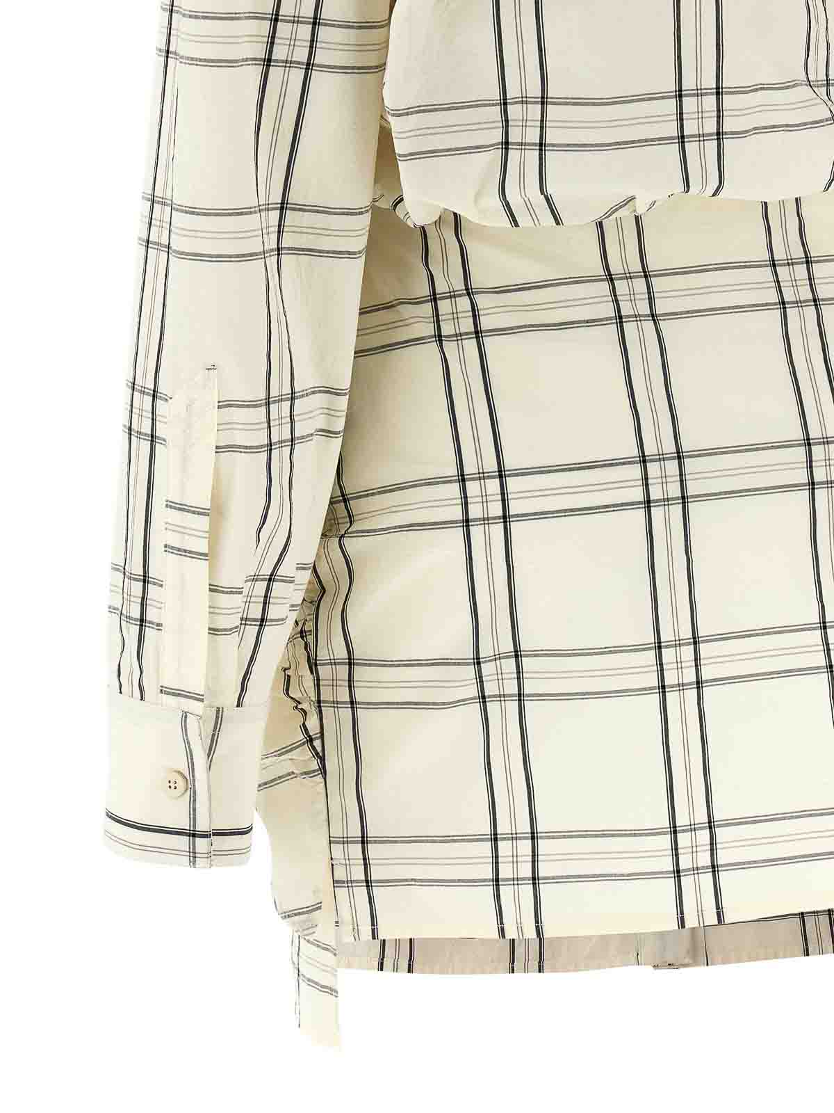 チェックプリントのコットンポプリンミニドレス。ウォレットシャツスタイル、ロゴ刺繍、フロントボタン留め、ロングカフスリーブ、アシンメトリーヘム。