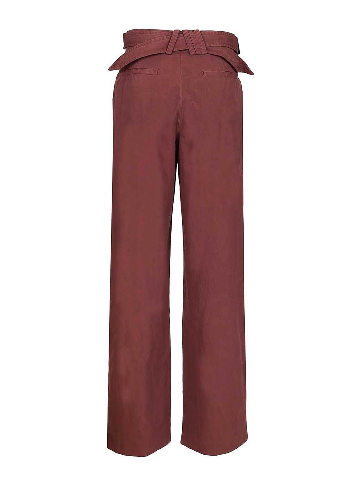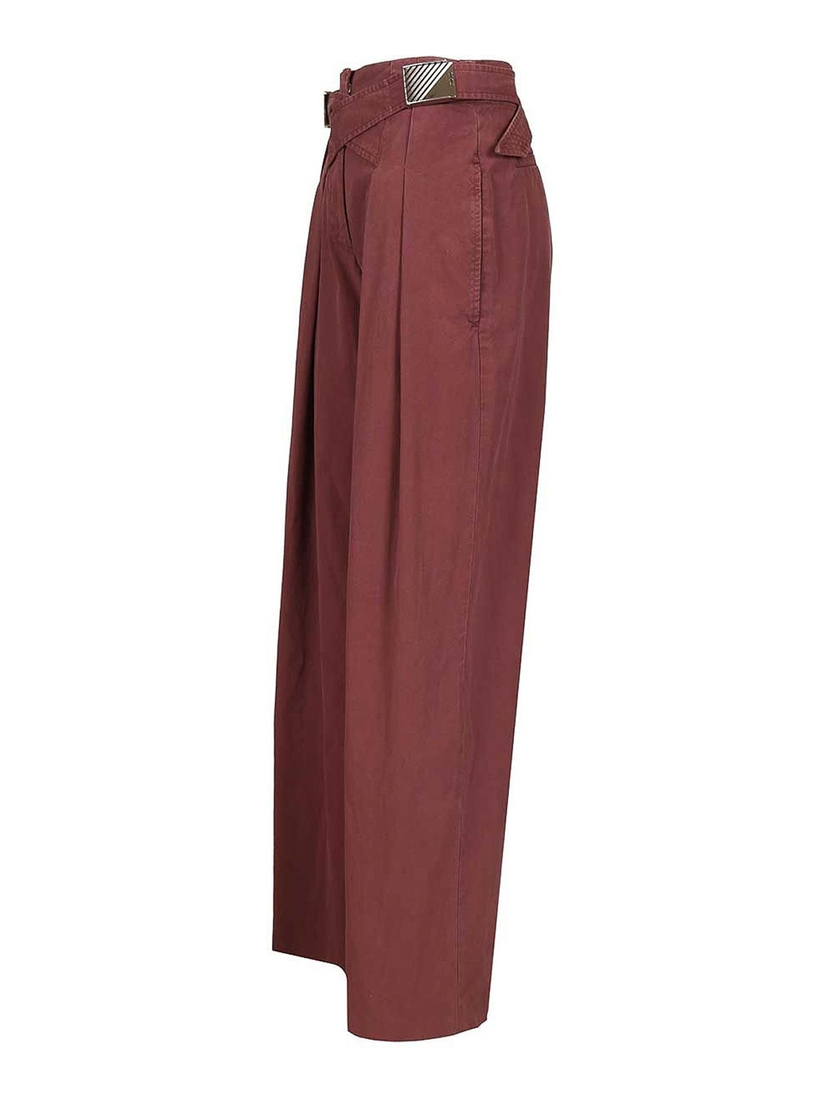 アッティコのキャンバスパンツはワイドで、ストレートレッグのワイドプリーツはウエストから始まり、脚にはバンドが付いており、ズボンの後ろで閉じるクロスベルトが付いています。ベルトのバックルは長方形です。