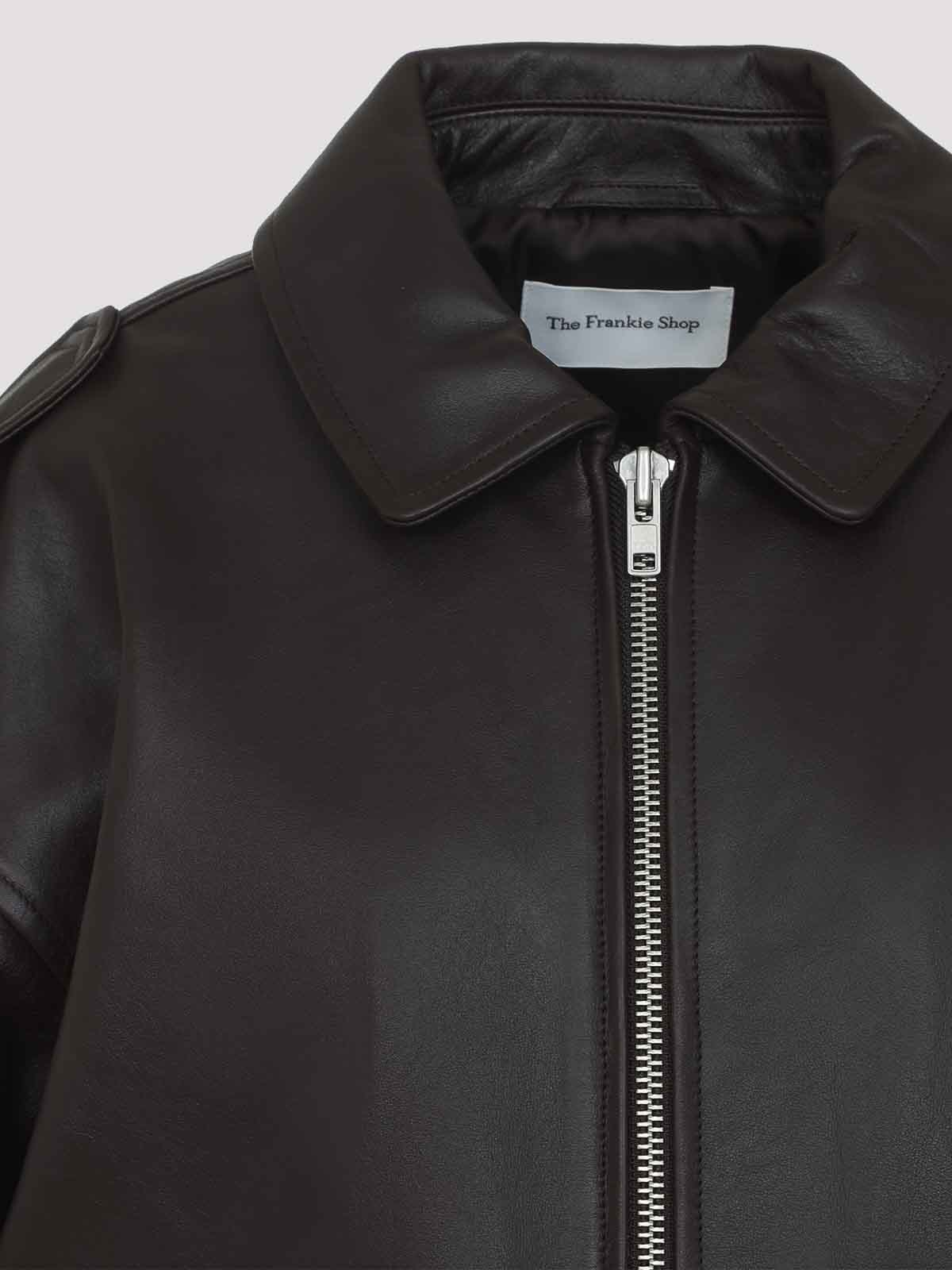 フランキーショップのバイパーブラウンレザージャケット。ブラウンレザー製、ポインテッドカラー、フロントツーウェイジッパー、ドロップショルダーにエポレット、ロングスリーブ、フロントにパッチポケット、リブ編みの袖口と裾、裏地、ボクシー、オーバーサイズフィット。