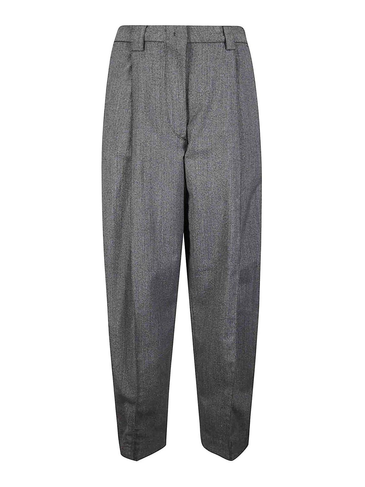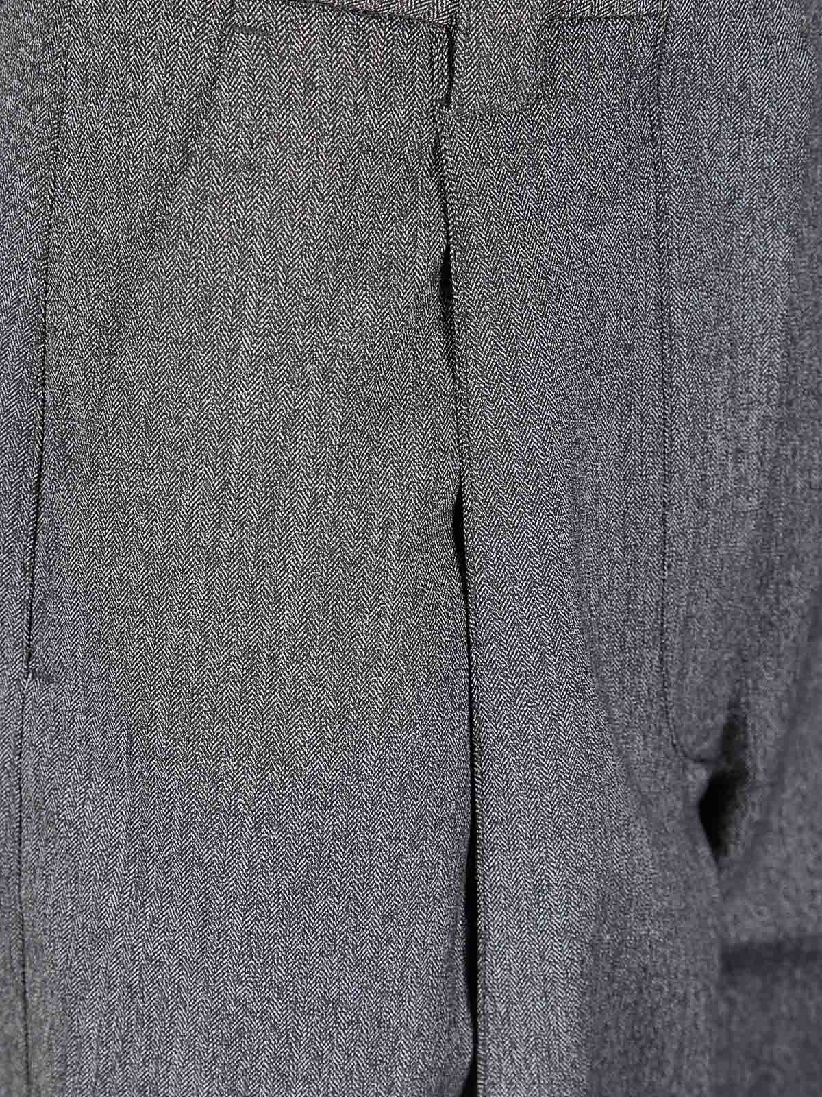 ダークグレーのウール混紡パンツ、ファスナー付きの隠しフロントクロージャー、フック、内部ボタン、フロントにプリーツ、サイドポケット2つ、バックにフラップポケット2つ。