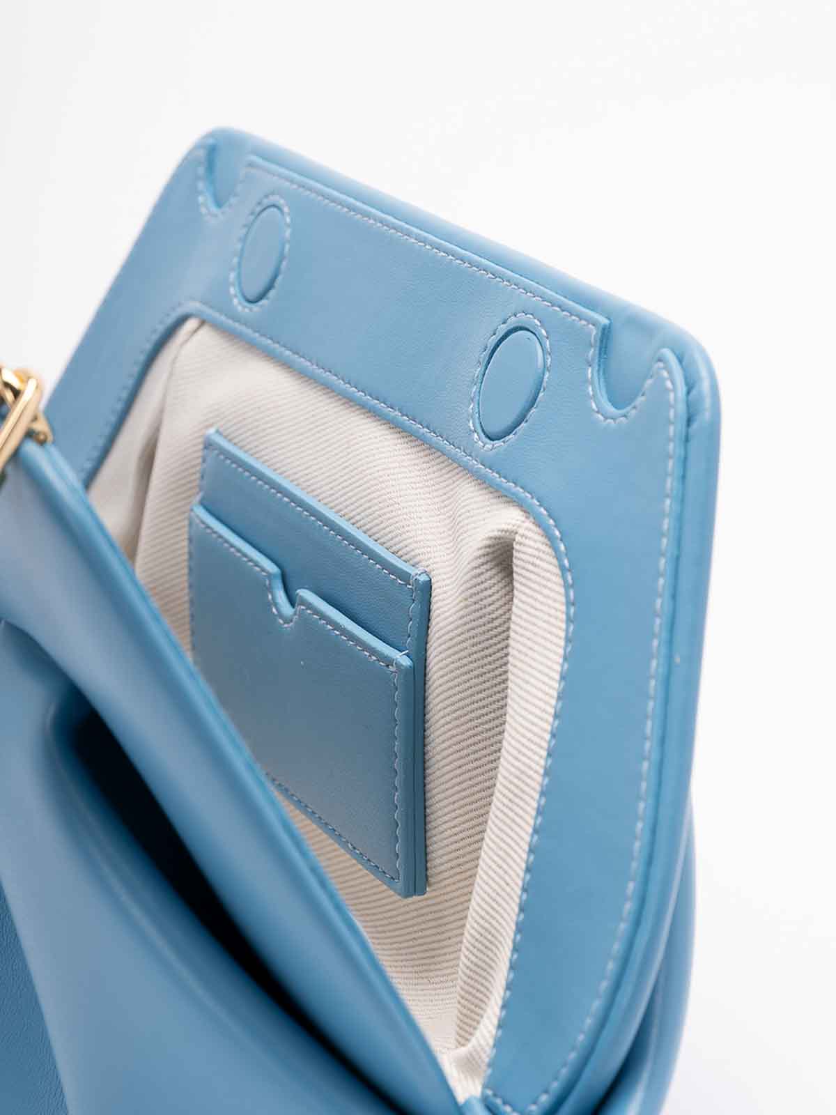 モダンで持続可能な外観のBIOSビーガン生地のバゲットバッグ。柔らかくて丈夫な構造は必須のラインにぴったりで、日常使いに最適です。ナイアガラカラーがモデルを引き立てます。ファスナー開閉、裏地付きの内装、モワールのシグネチャーがモデルを引き立てます。
