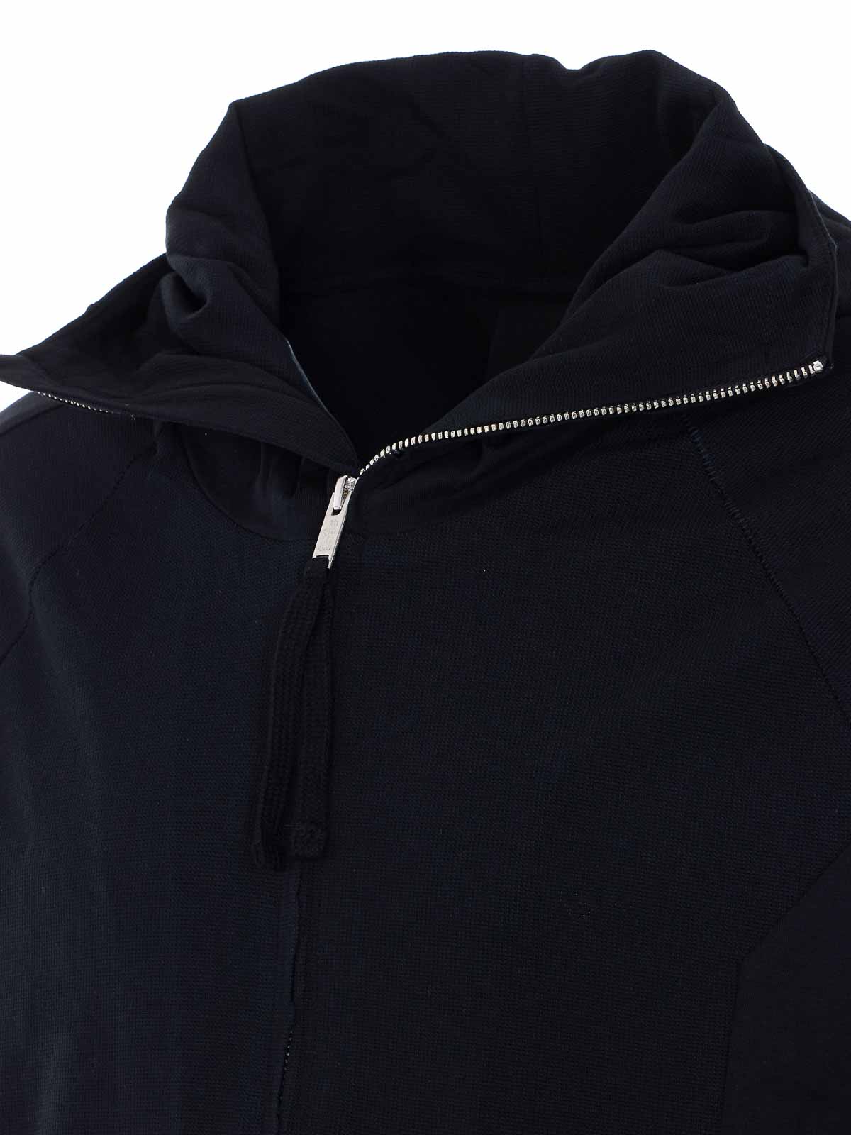 トムクロムの黒いジッパー付きパーカー、ベルクロ留め付きポケット、フードディテール