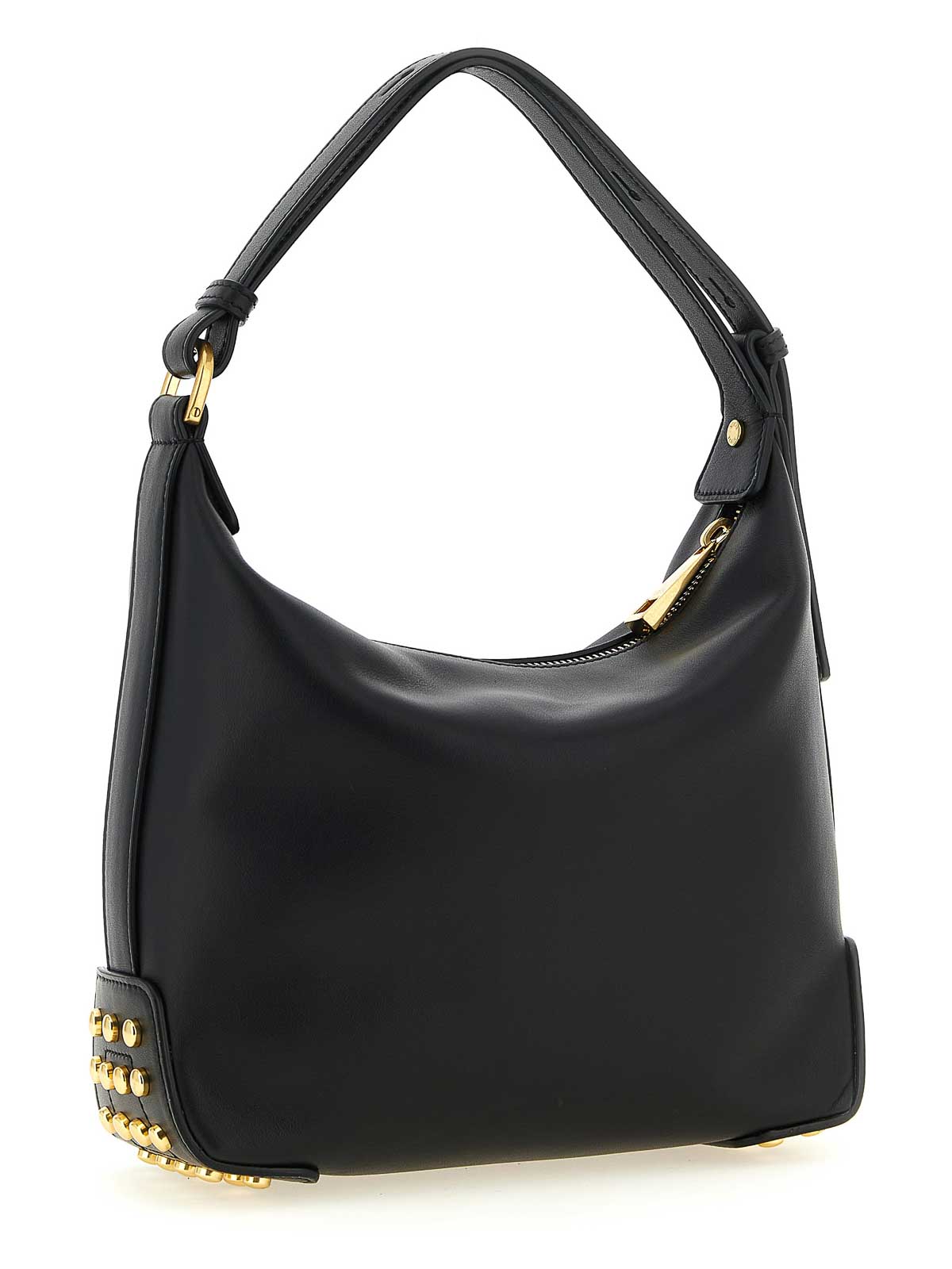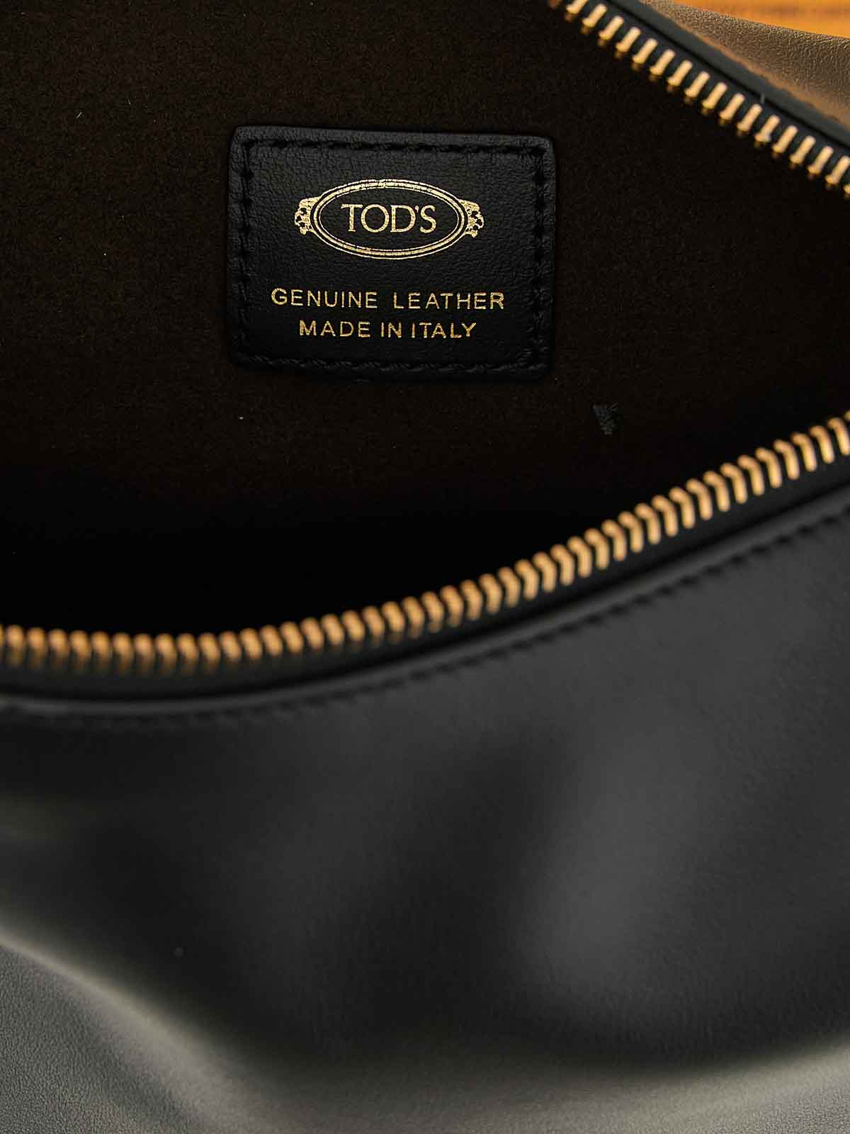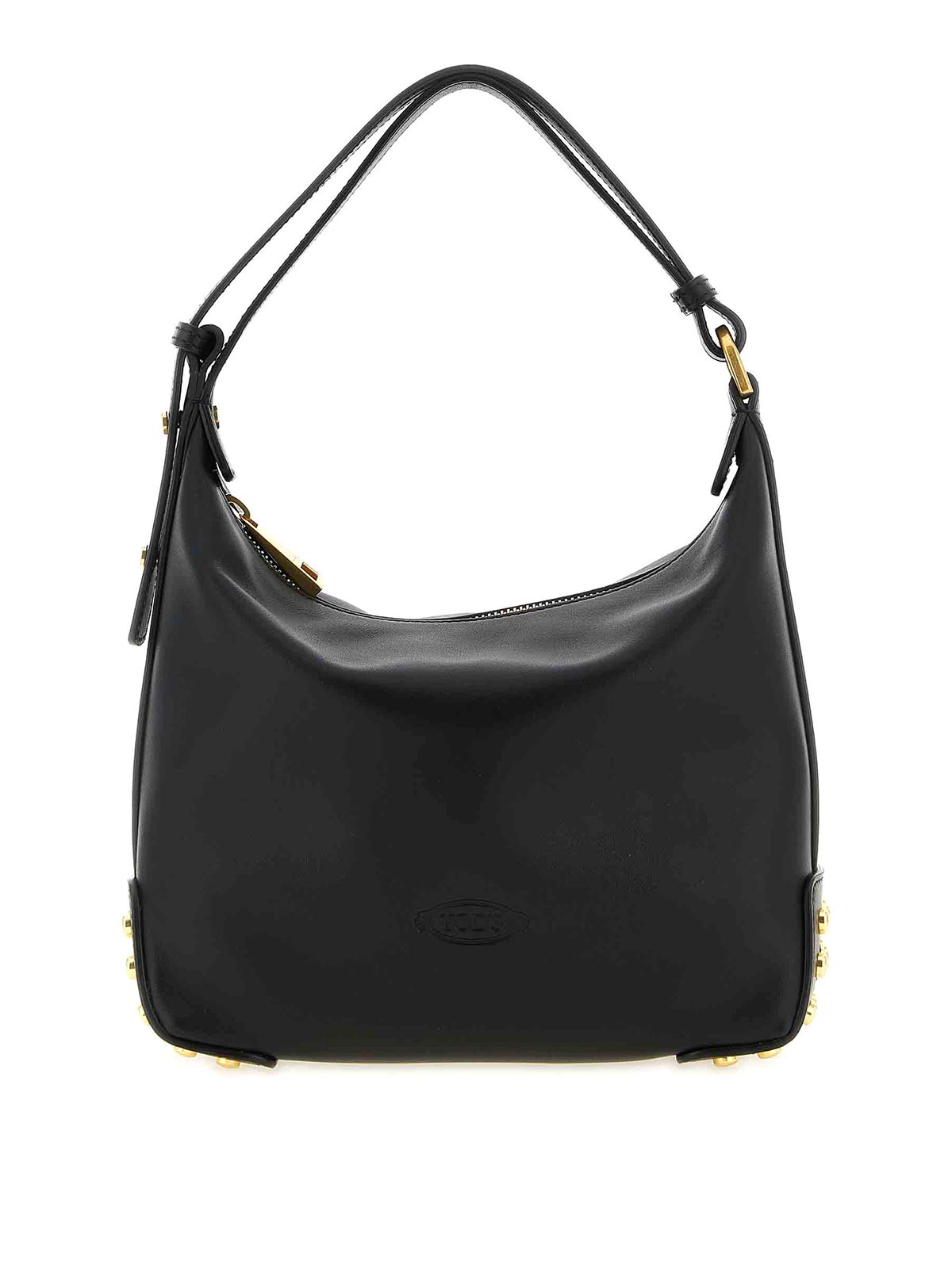 ソフトカーフレザー製のメタルドットのミニショルダーバッグ。トッズソールのアイコニックなラバーパッドを思わせるコーナーのメタルディテール、前面にエンボス加工ロゴ、調節可能なハンドル、上部にファスナー付き。