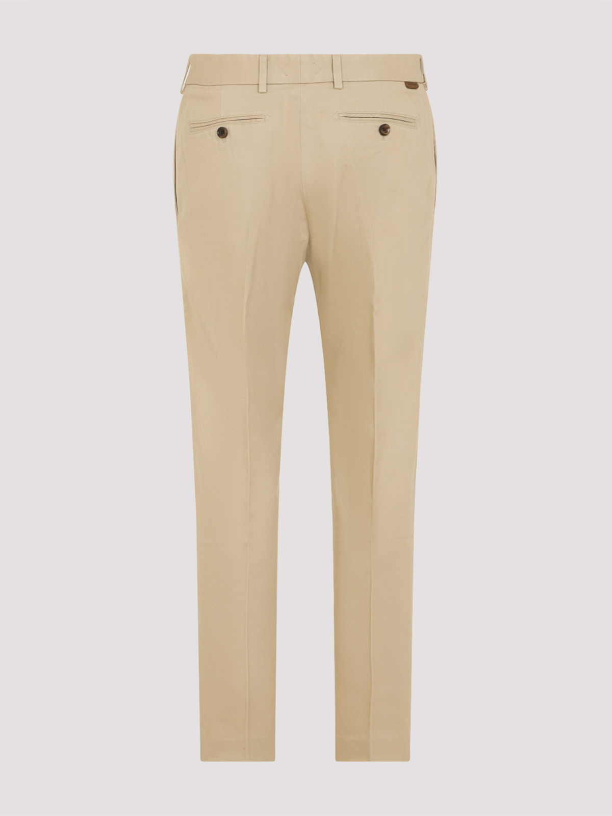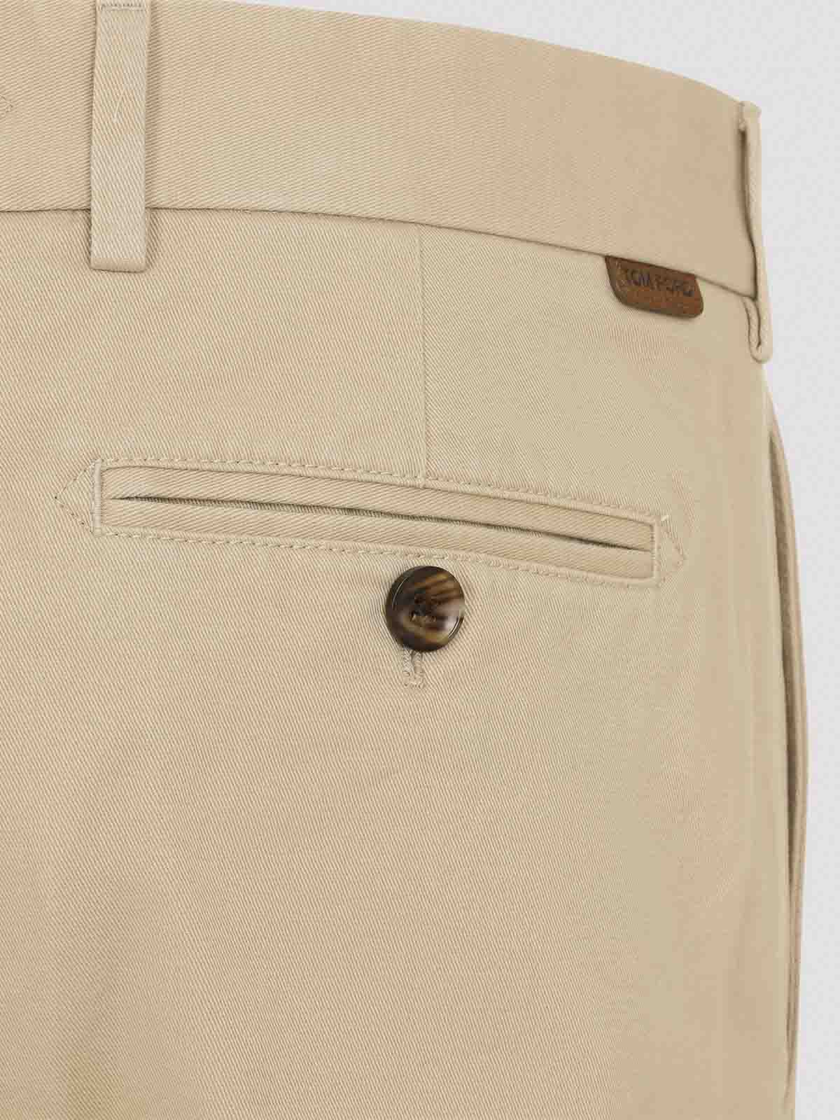 トムフォードベージュコットンパンツ。ベージュコットン製、ミッドウエスト、ベルトループ、前面隠しファスナー、斜めポケット、緩い中央の折り目、背面にウェルトポケット、ストレートレッグ。