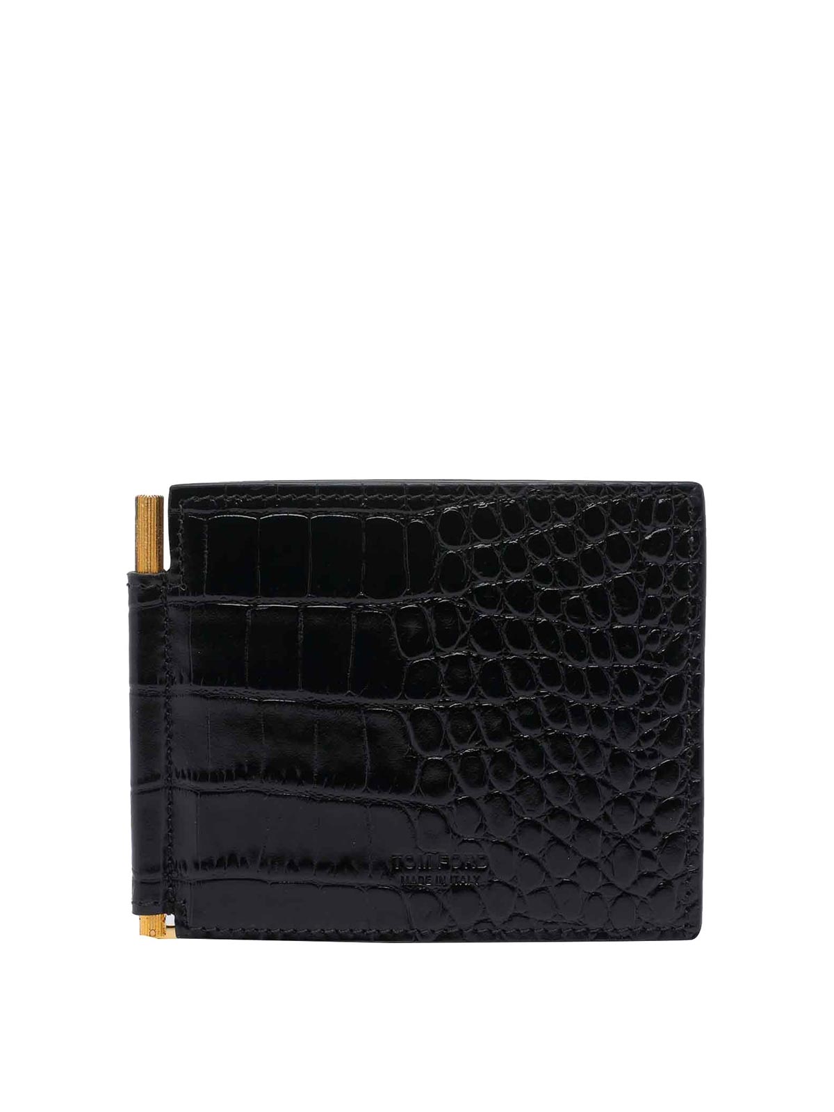 トムフォードブラックTラインクロコクリップウォレット、8スロット、ノート用クリップディテール