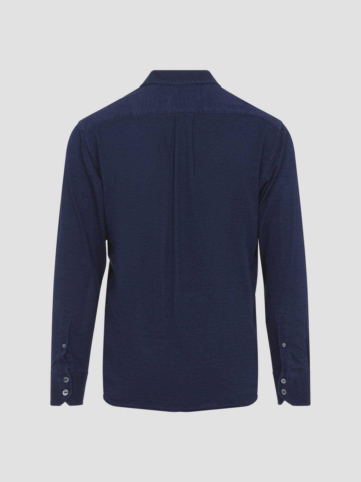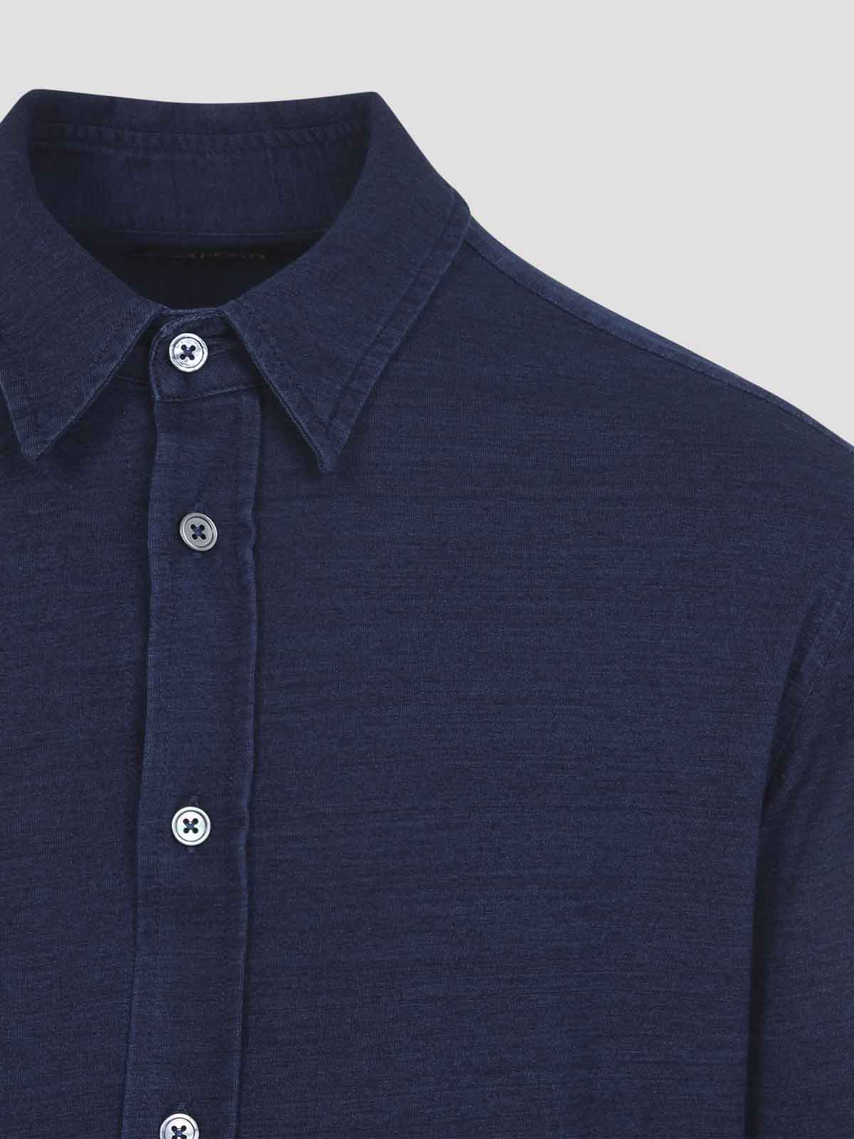 トムフォードミッドナイトブルーコットンロングスリーブシャツ。ピュアミッドナイトブルーコットンシャツ、ポインテッドカラー、フロントボタン留め、ロングスリーブ、ボタン付きカフス、ストレートヘム。