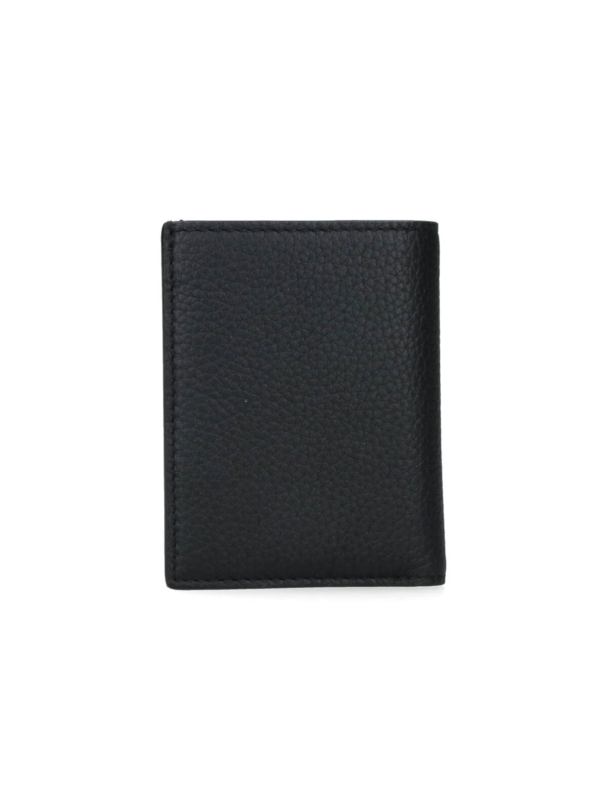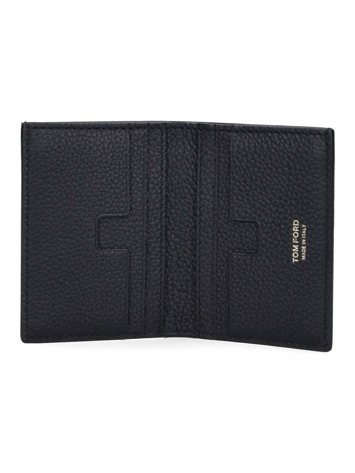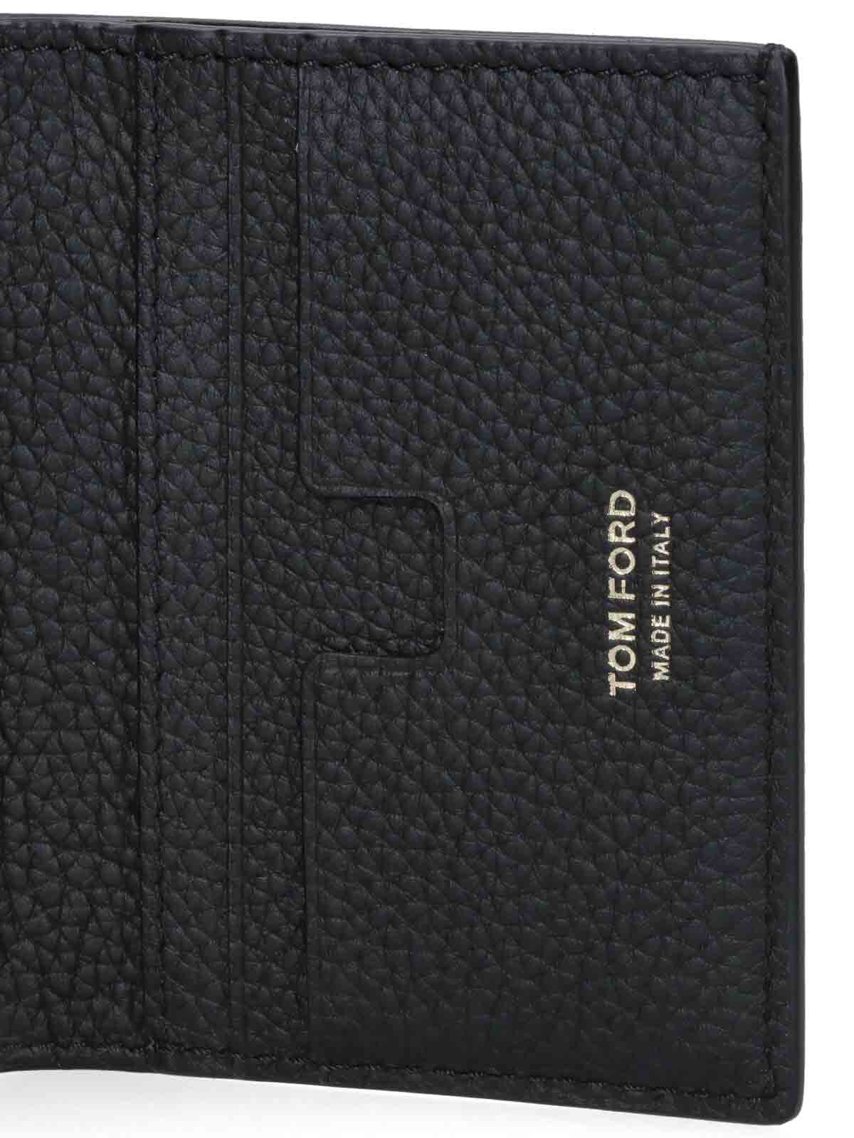 ブラックカーフスキンのトムフォード二つ折りカードホルダー。前面にゴールドのロゴが型押しされ、内側に4つのカードスロットが付いています。